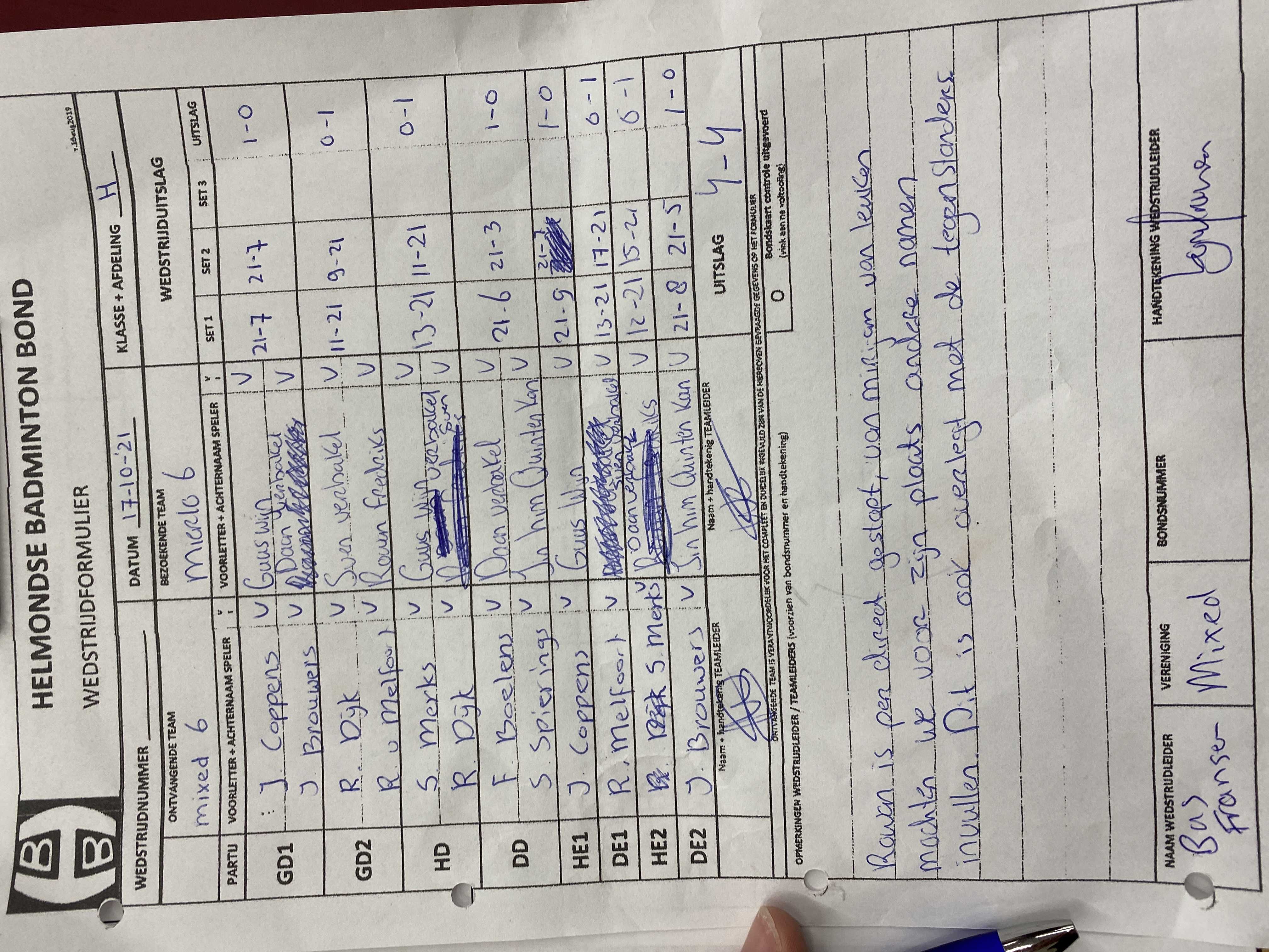 | 09:30 | zo. 17-10-2021 | Mixed 6 | - | Mierlo 6 | 14 | 4 - 4 | ||