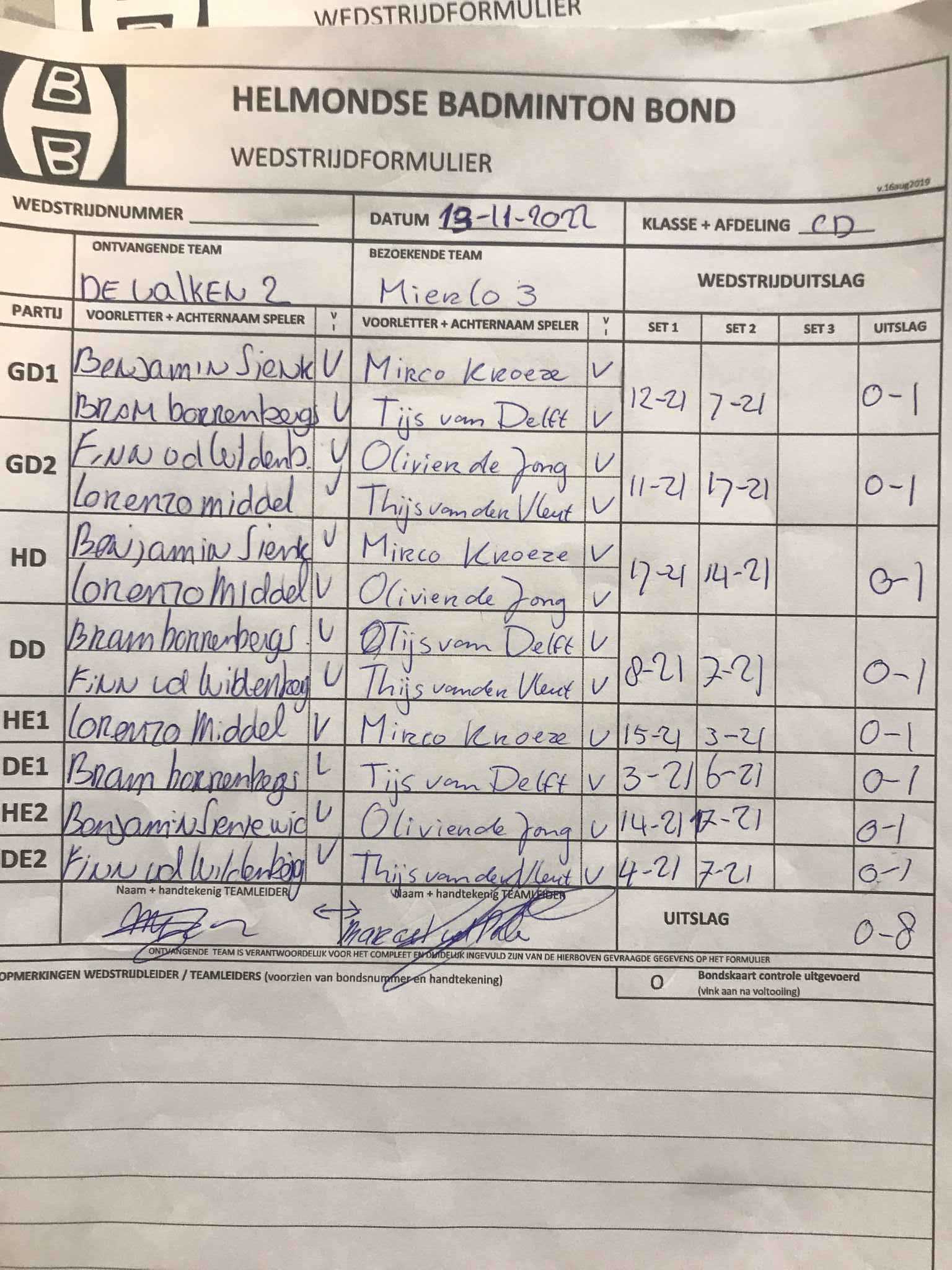| 09:30 | zo. 13-11-2022 | De Valken 2 | - | Mierlo 3 | 5 | 0 - 8 | ||