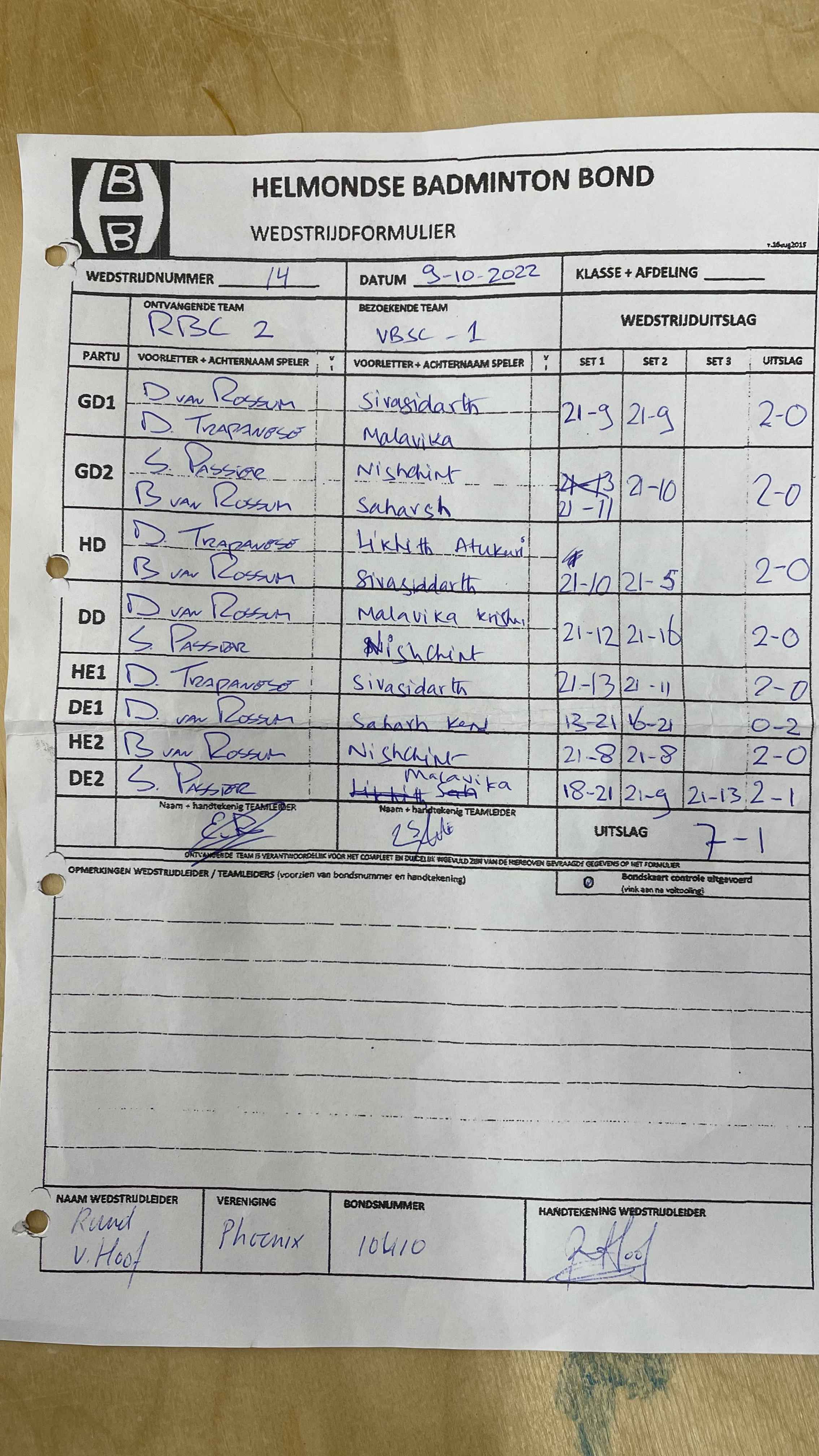 | 09:30 | zo. 18-12-2022 | Mixed 6 | - | VBSC 1 | 13 | 1 - 7 |