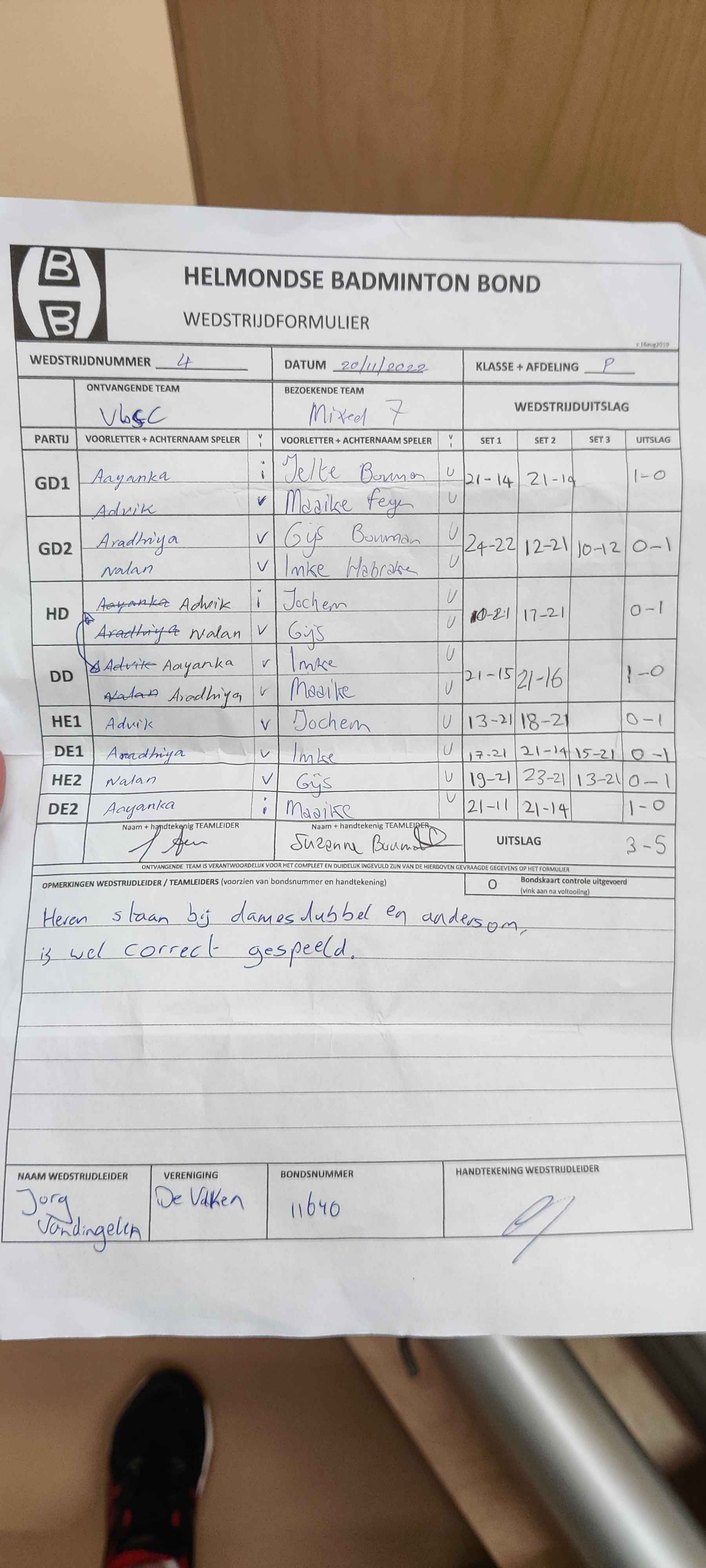 | 09:30 | zo. 20-11-2022 | VBSC 1 | - | Mixed 6 | 2 | 4 - 4 | ||