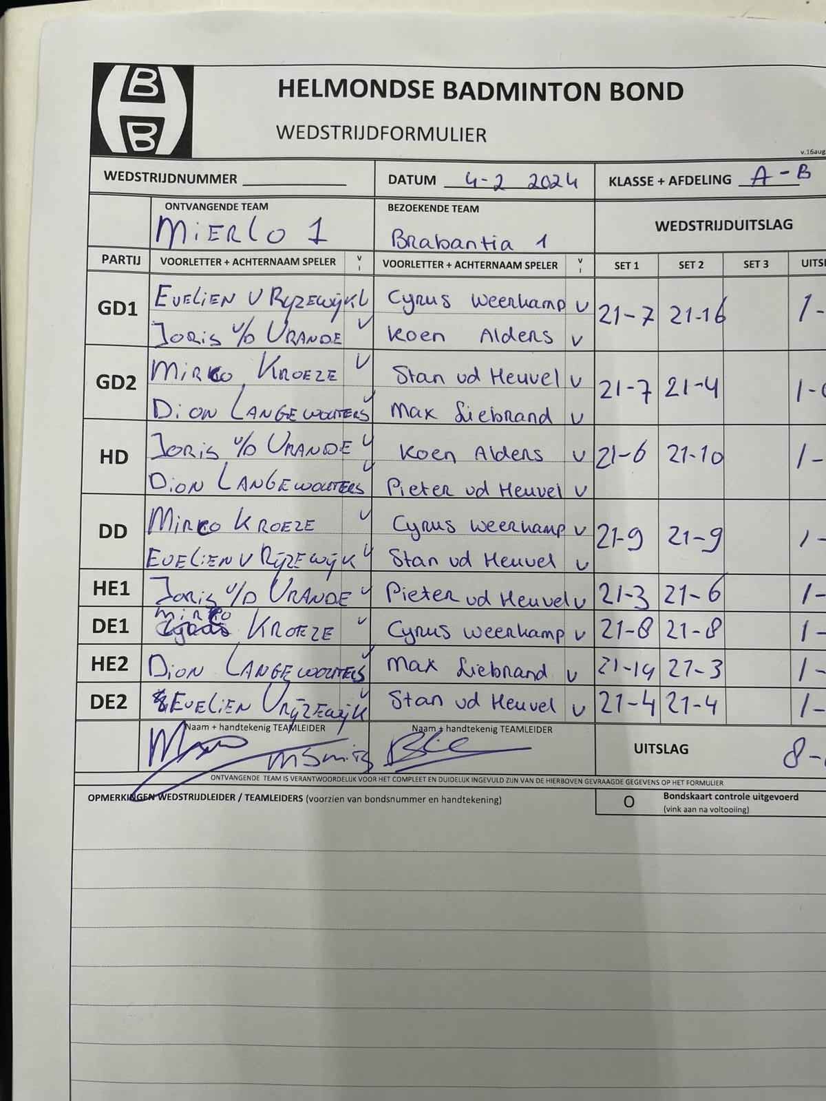 | 09:30 | zo. 04-02-2024 | Mierlo 1 | - | Brabantia 1 | 1 | 8 - 0 | ||