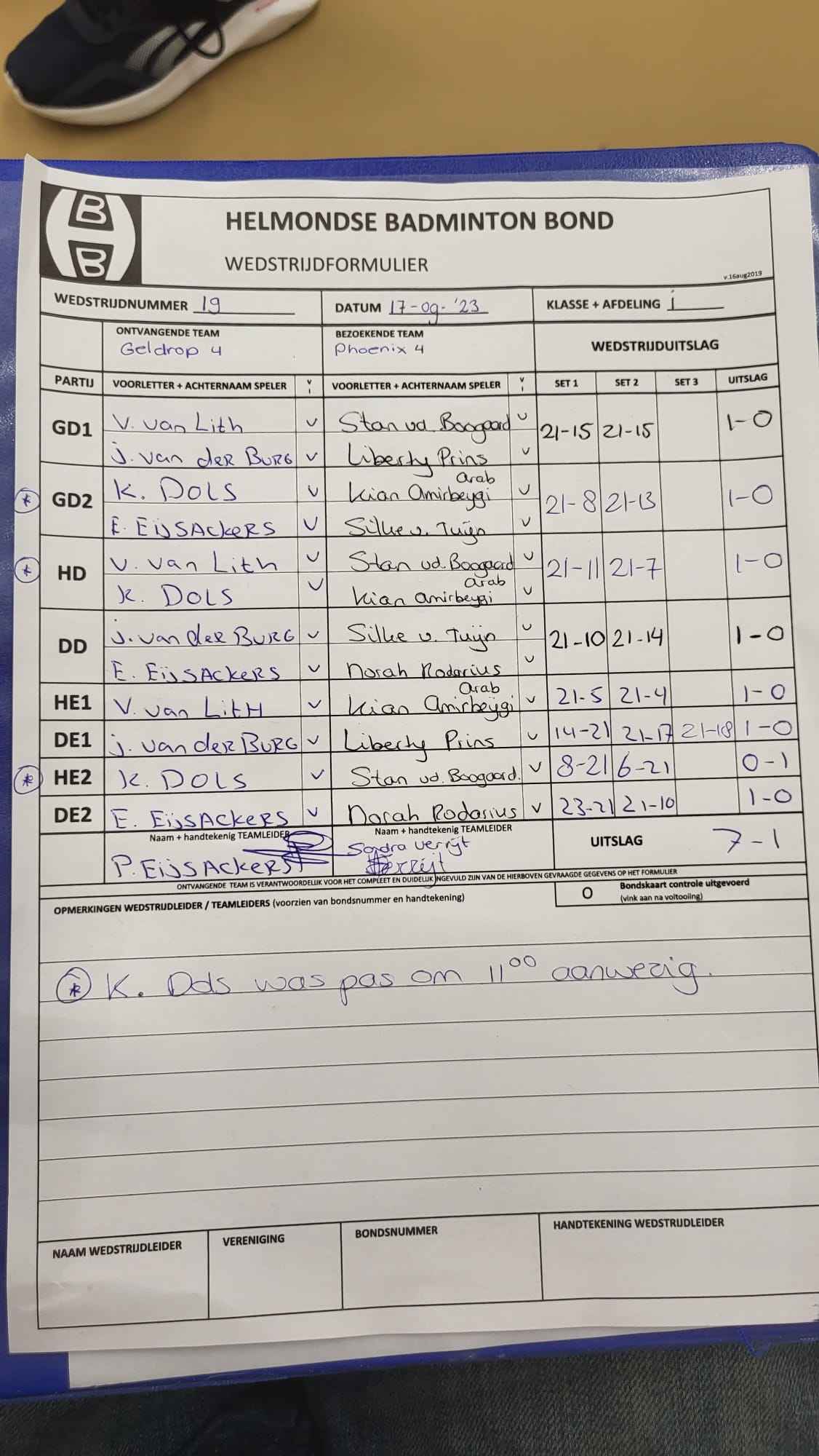 | 09:30 | zo. 17-09-2023 | Geldrop 4 | - | Phoenix 4 | 12 | 7 - 1 | ||