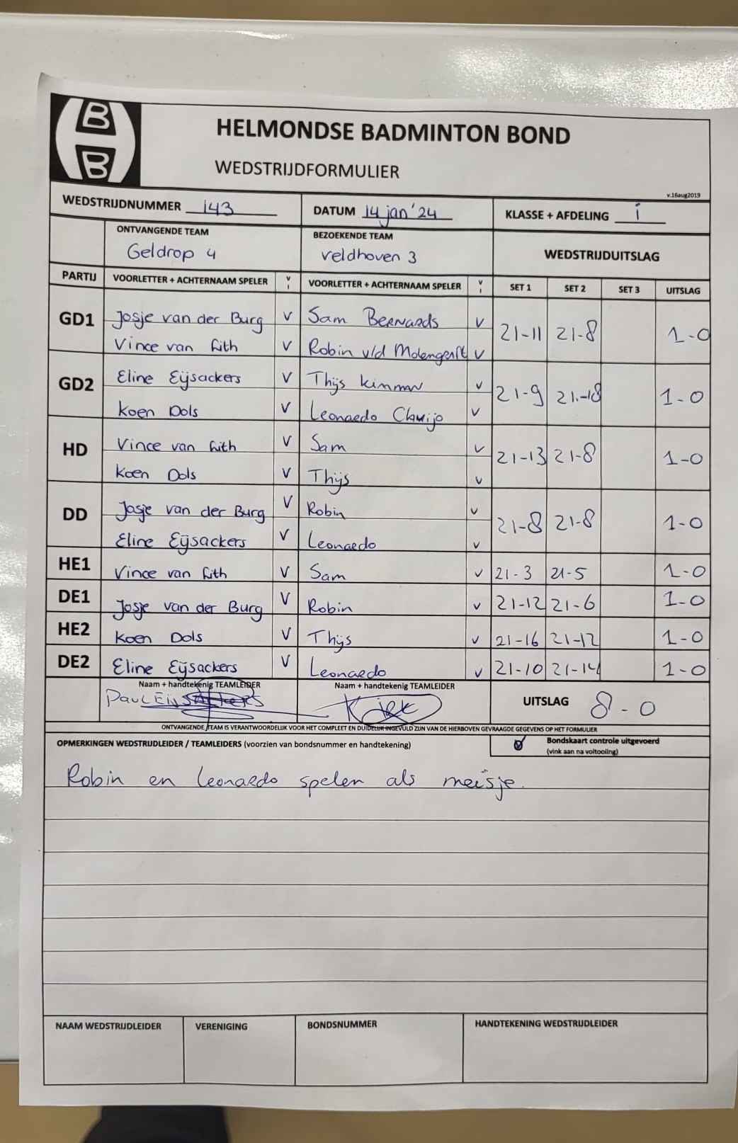 | 09:30 | zo. 14-01-2024 | Geldrop 4 | - | Veldhoven 3 | 4 | 8 - 0 | ||