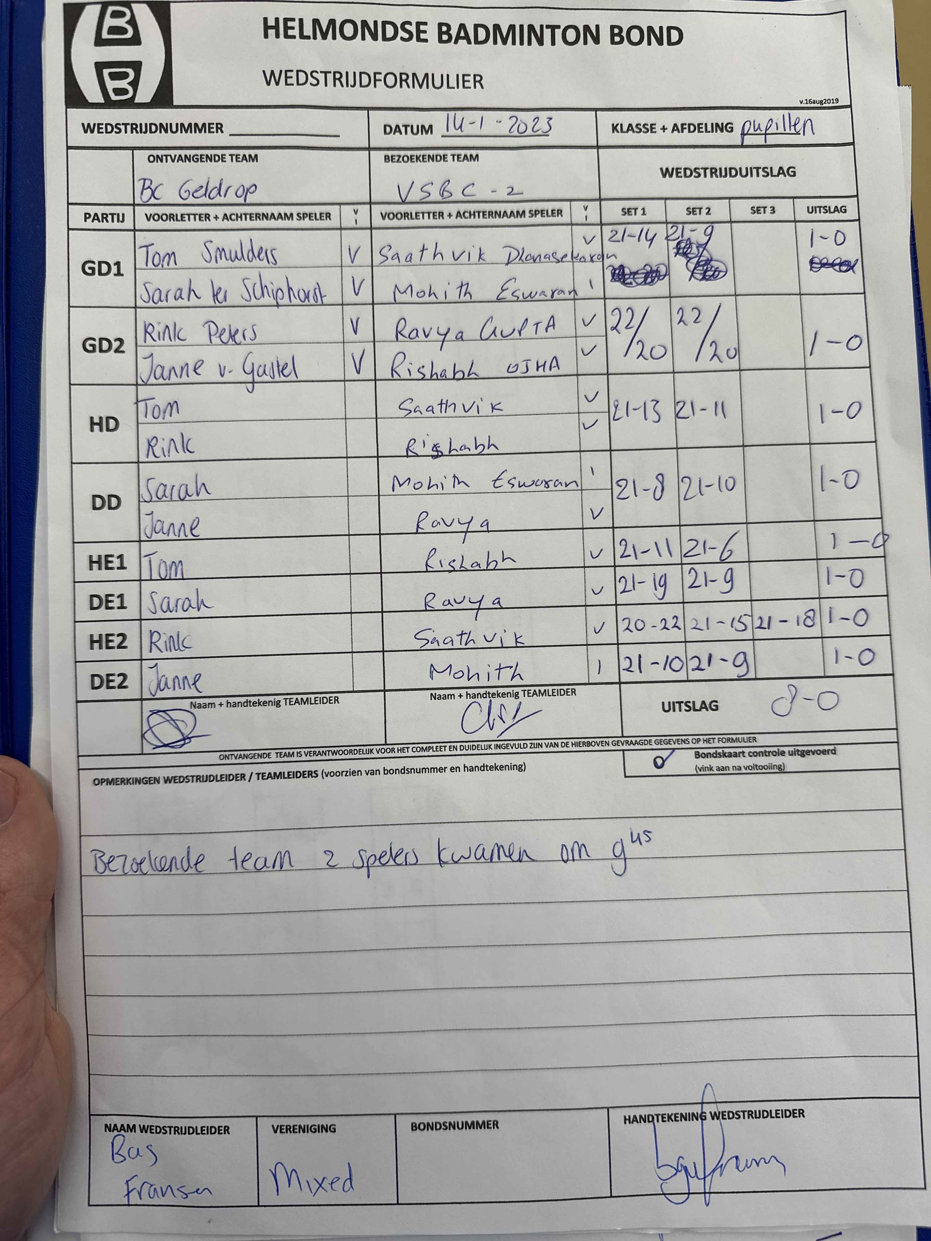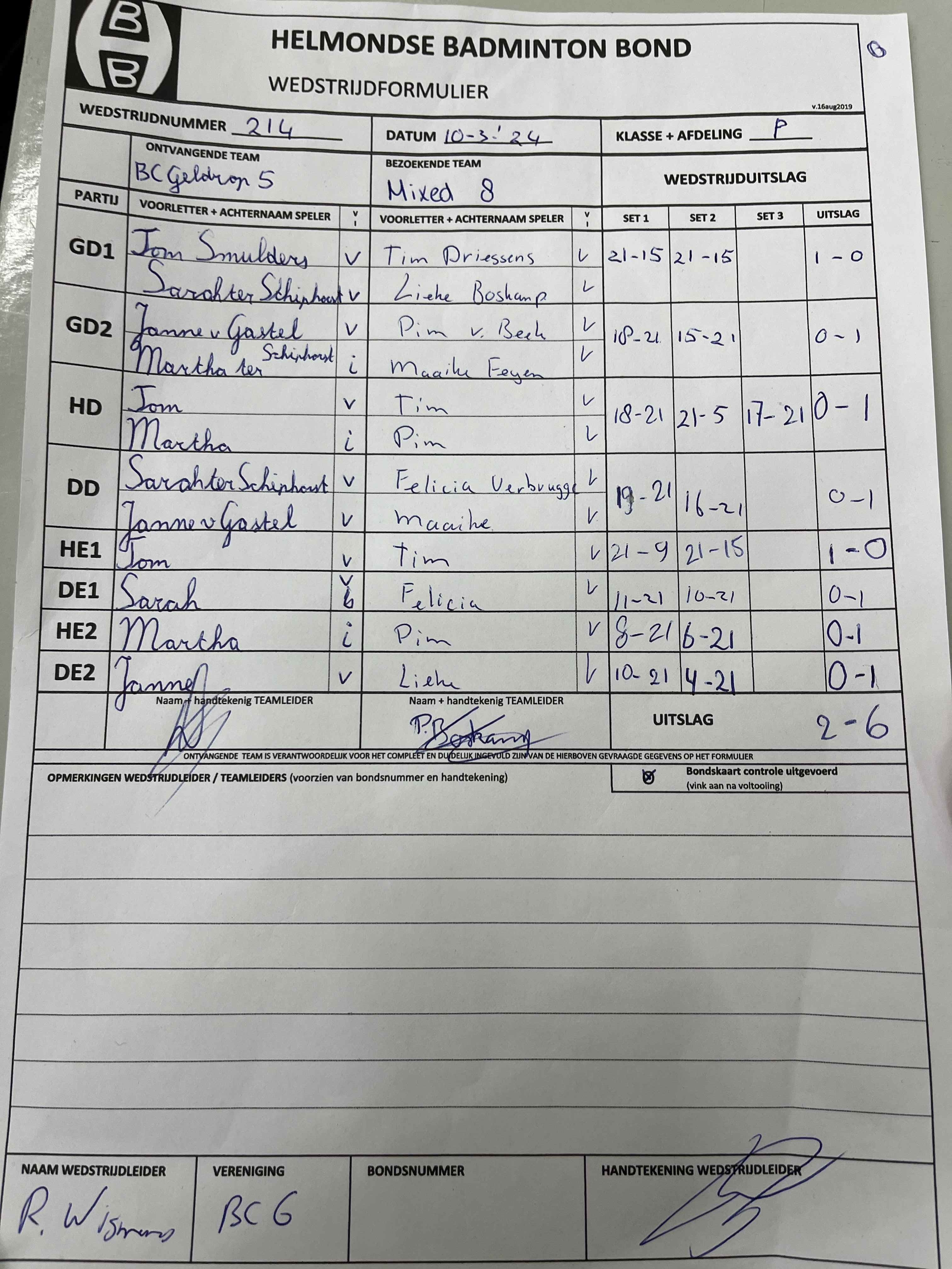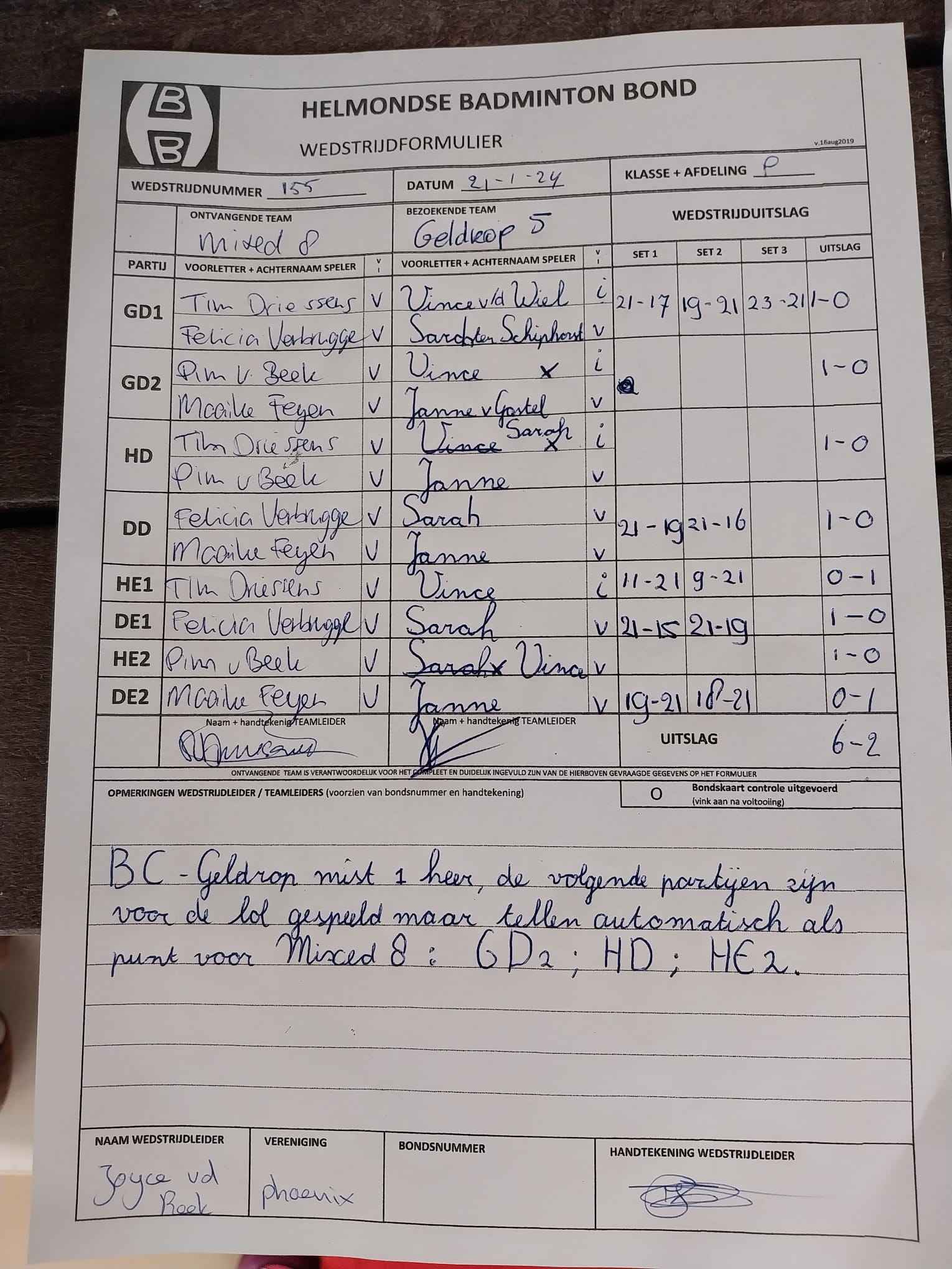 | 09:30 | zo. 21-01-2024 | Mixed 8 | - | Geldrop 5 | 11 | 6 - 2 | ||