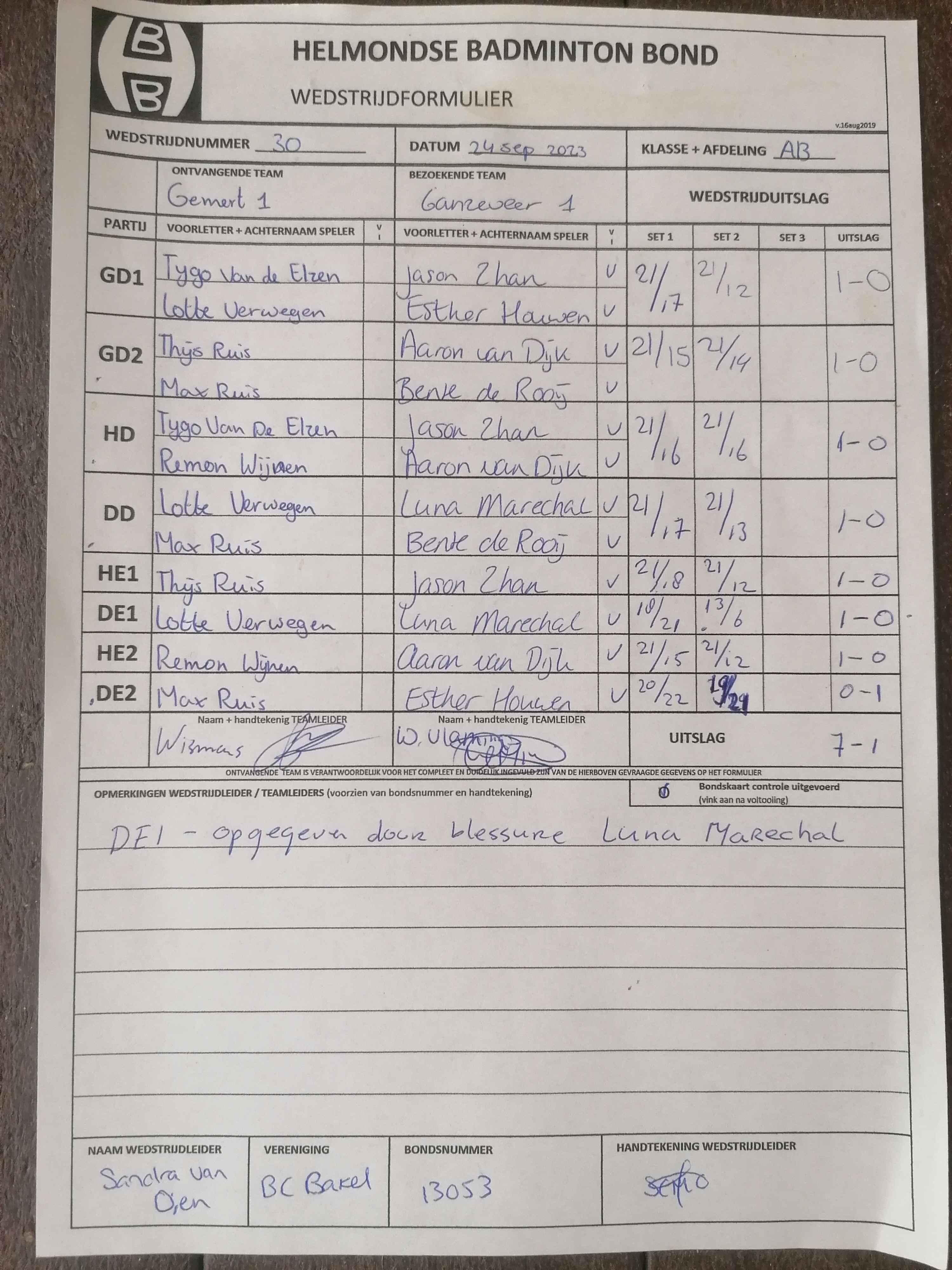 | 09:30 | zo. 24-09-2023 | Gemert 1 | - | Ganzeveer 1 | 12 | 7 - 1 | ||