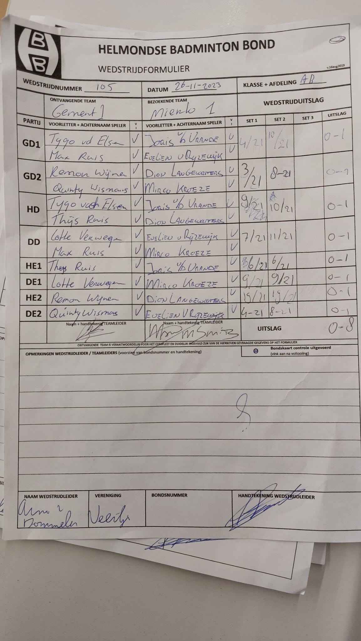 | 09:30 | zo. 26-11-2023 | Gemert 1 | - | Mierlo 1 | 11 | 0 - 8 | ||