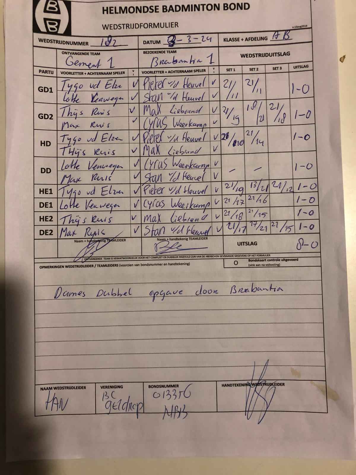 | 09:30 | zo. 03-03-2024 | Gemert 1 | - | Brabantia 1 | 2 | 8 - 0 | ||