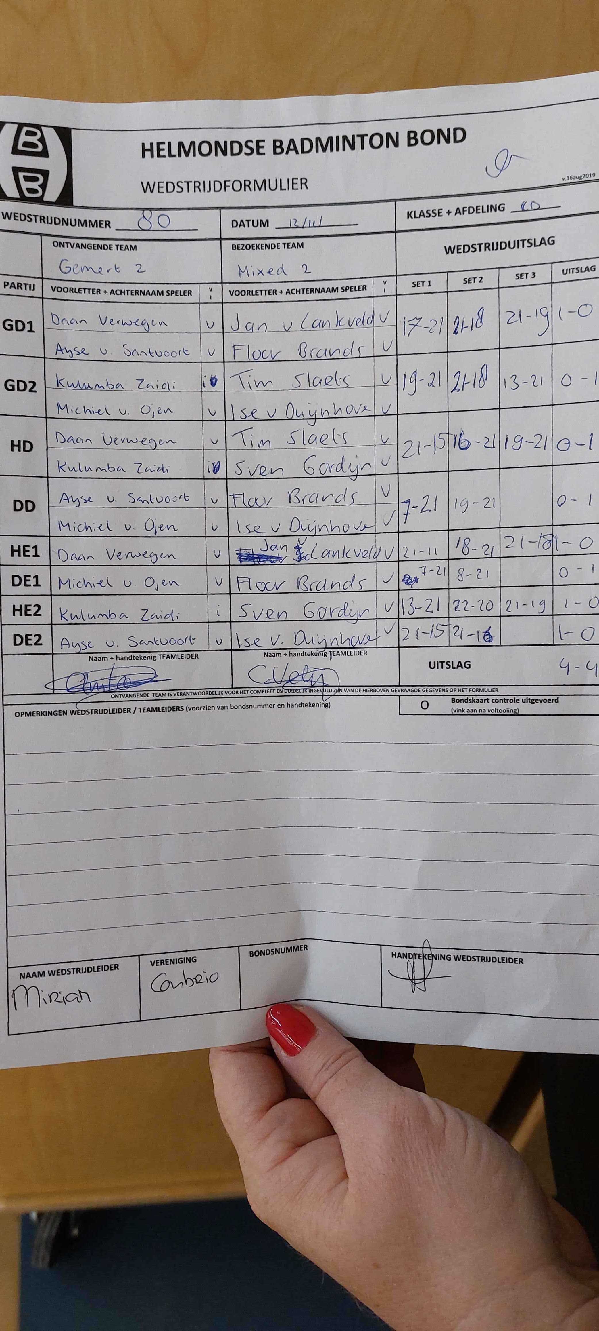 | 09:30 | zo. 12-11-2023 | Gemert 2 | - | Mixed 2 | 3 | 4 - 4 | ||