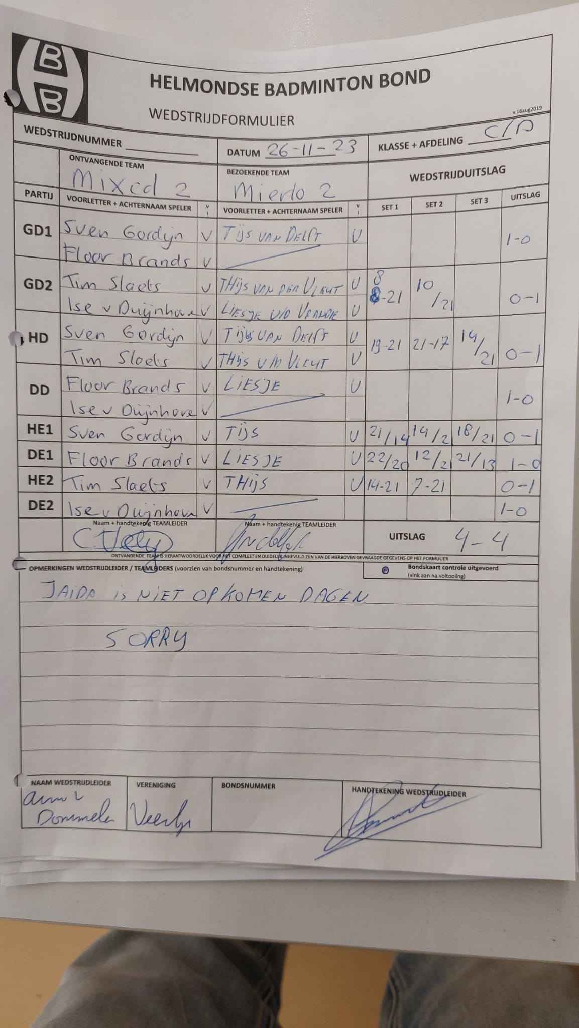 | 09:30 | zo. 26-11-2023 | Mixed 2 | - | Mierlo 2 | 15 | 4 - 4 | ||