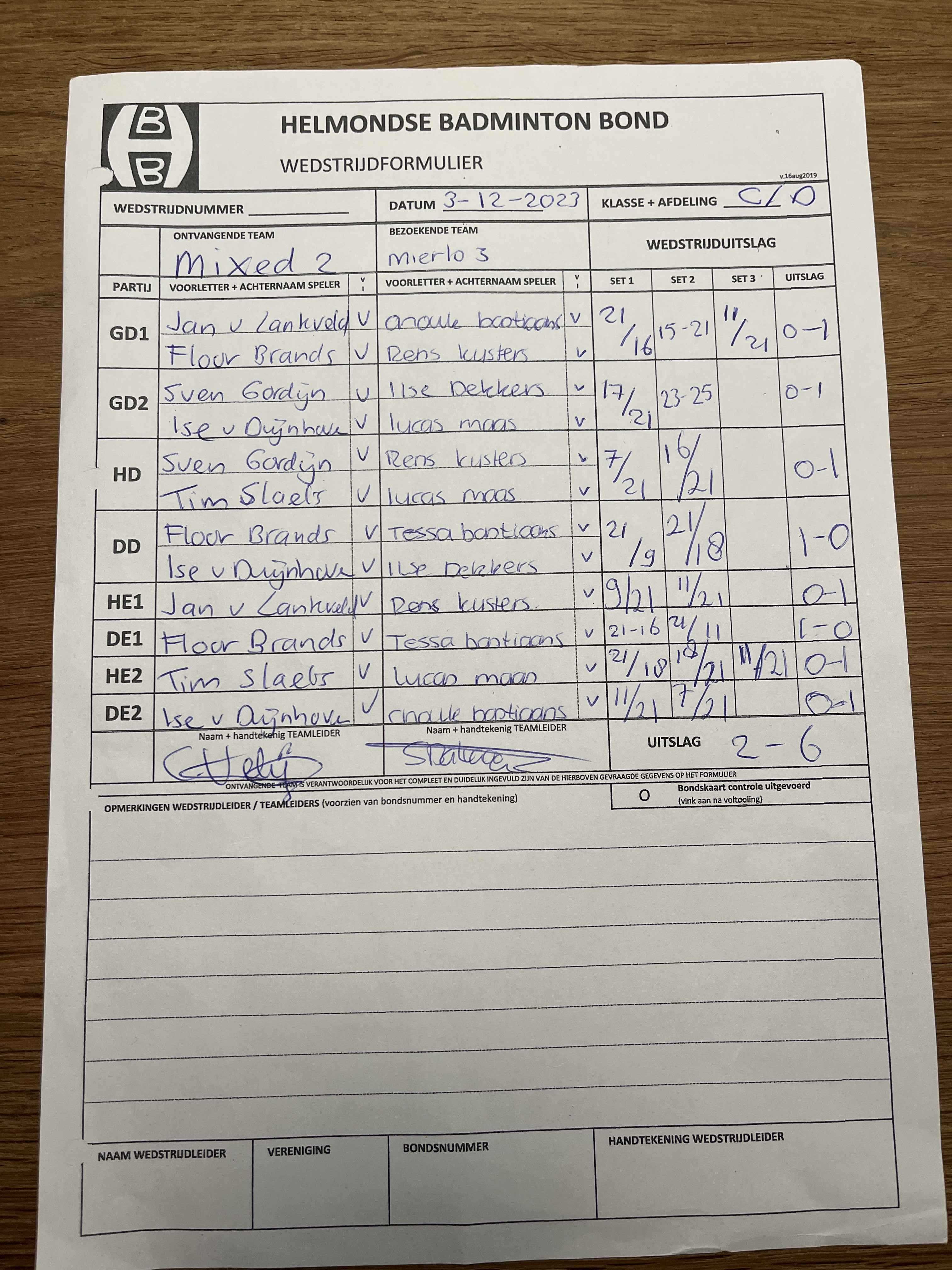 | 09:30 | zo. 03-12-2023 | Mixed 2 | - | Mierlo 3 | 5 | 2 - 6 | ||