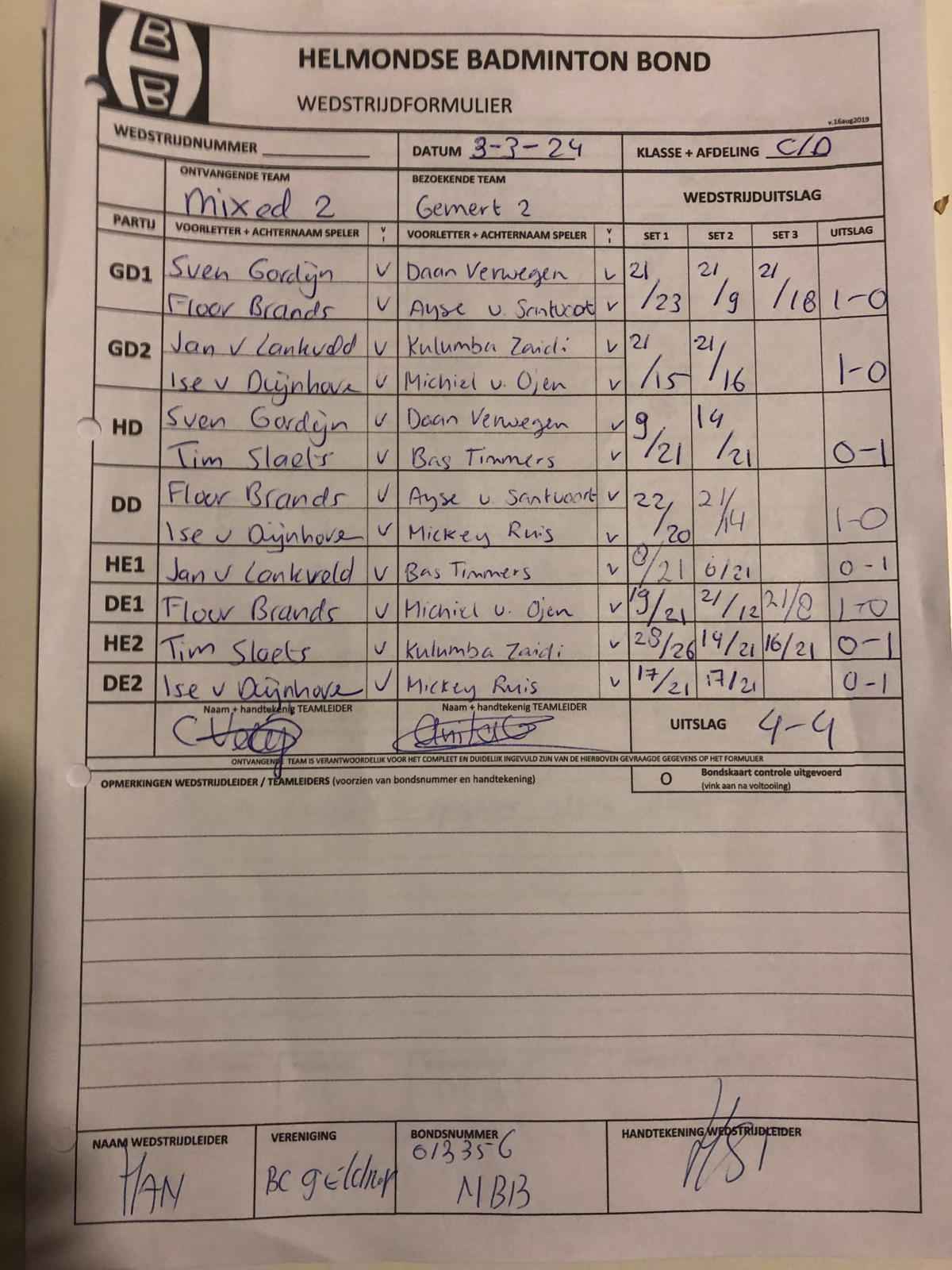 | 09:30 | zo. 03-03-2024 | Mixed 2 | - | Gemert 2 | 13 | 4 - 4 | ||