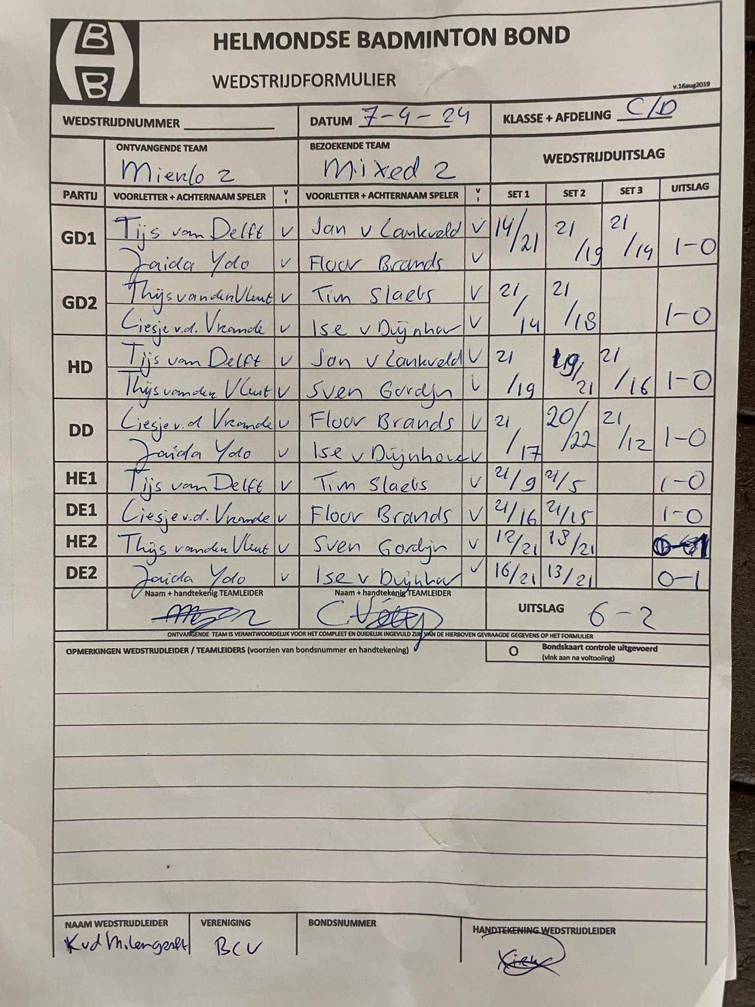 | 09:30 | zo. 07-04-2024 | Mierlo 2 | - | Mixed 2 | 1 | 6 - 2 | ||