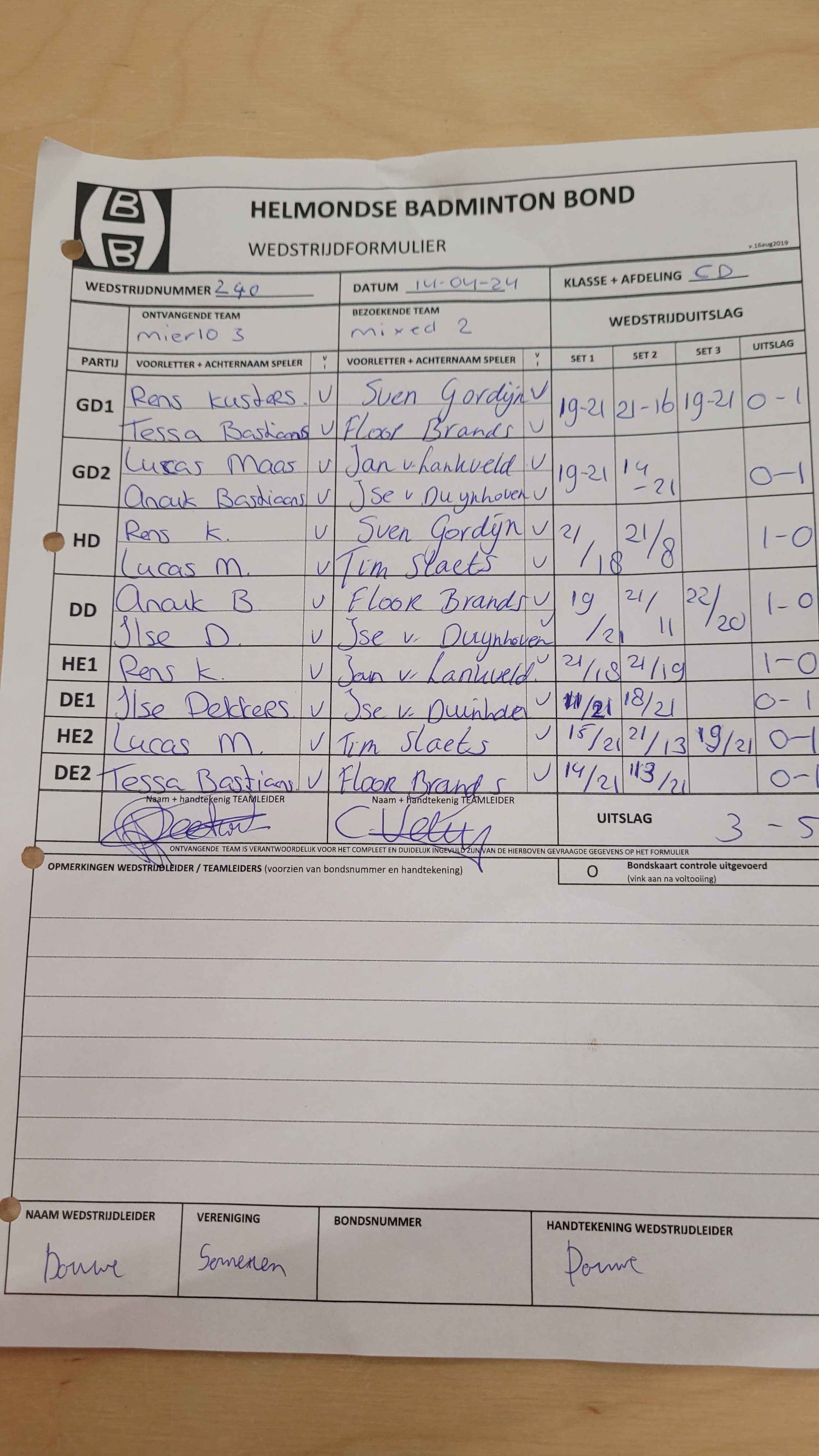 | 09:30 | zo. 14-04-2024 | Mierlo 3 | - | Mixed 2 | 5 | 3 - 5 | ||