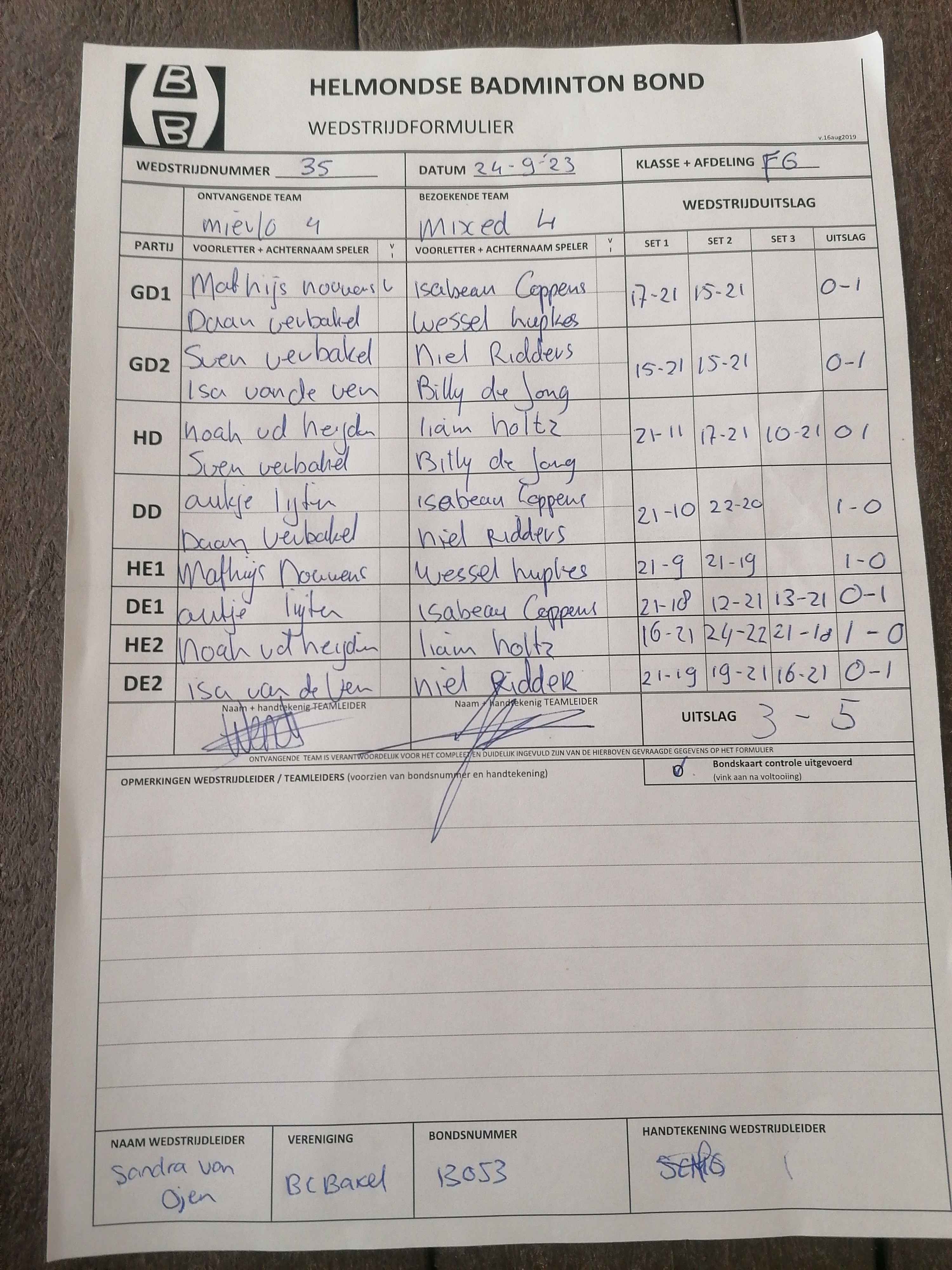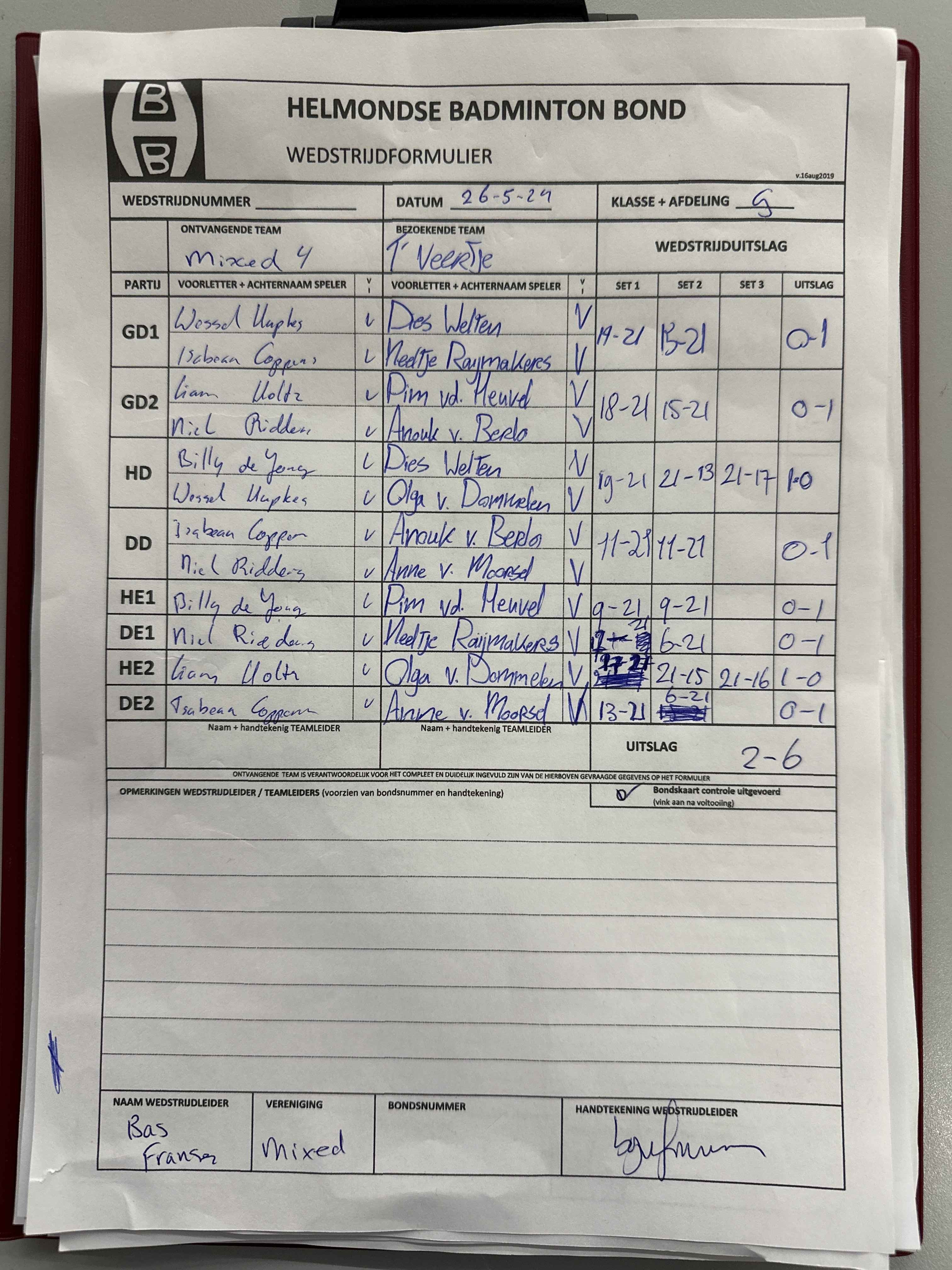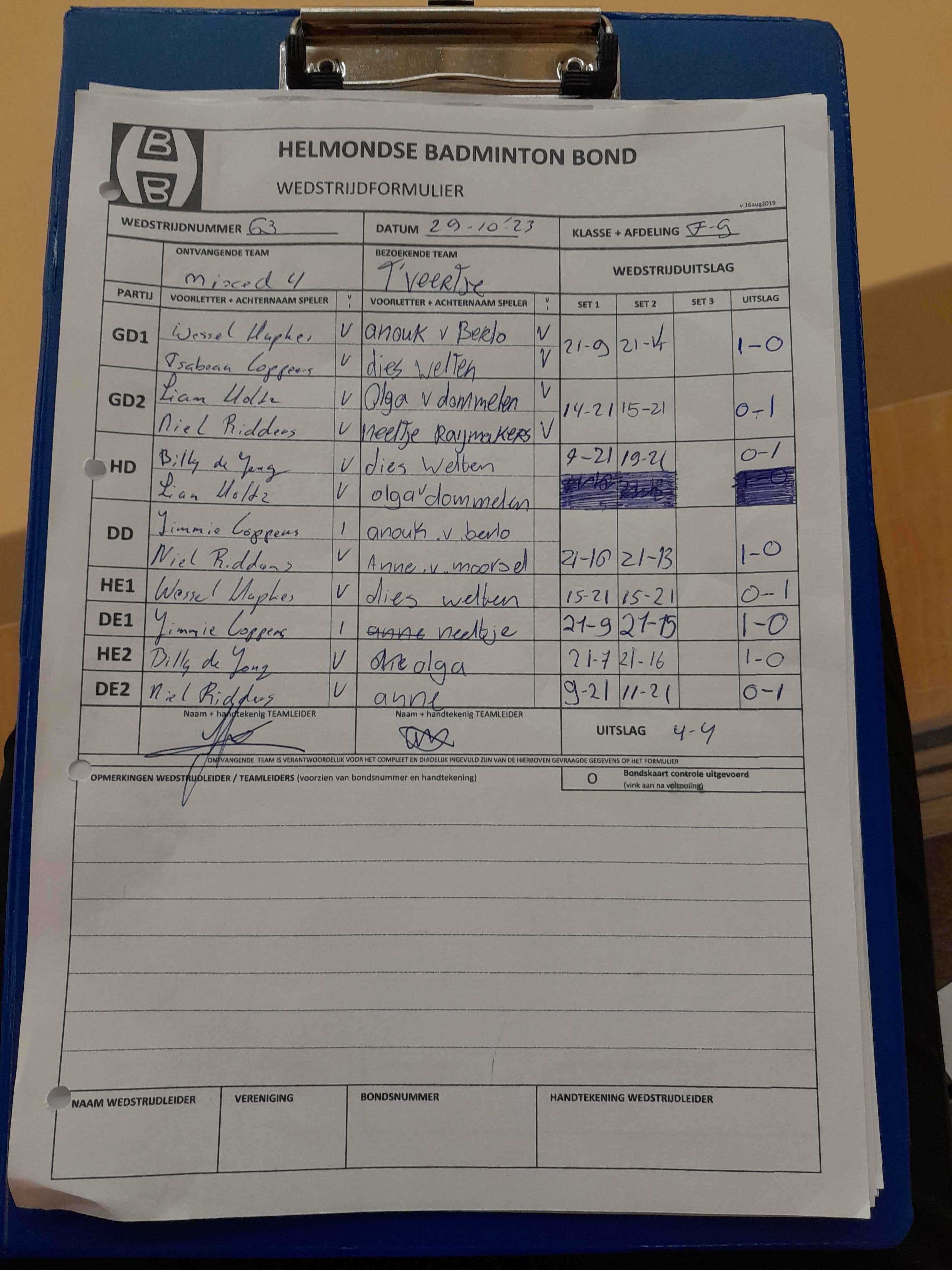 | 09:30 | zo. 26-11-2023 | Mixed 4 | - | Gemert 3 | 1 | 2 - 6 | ||