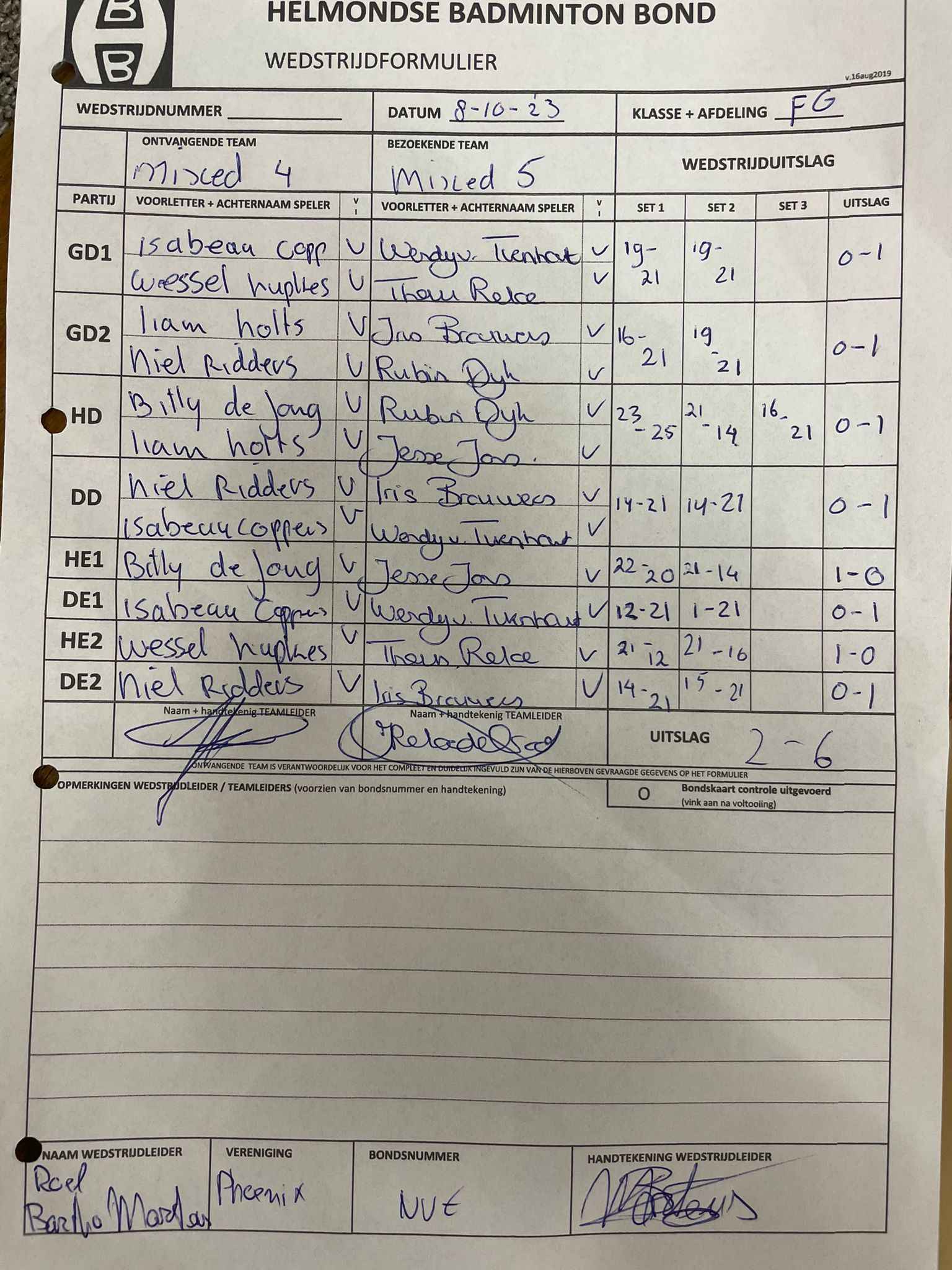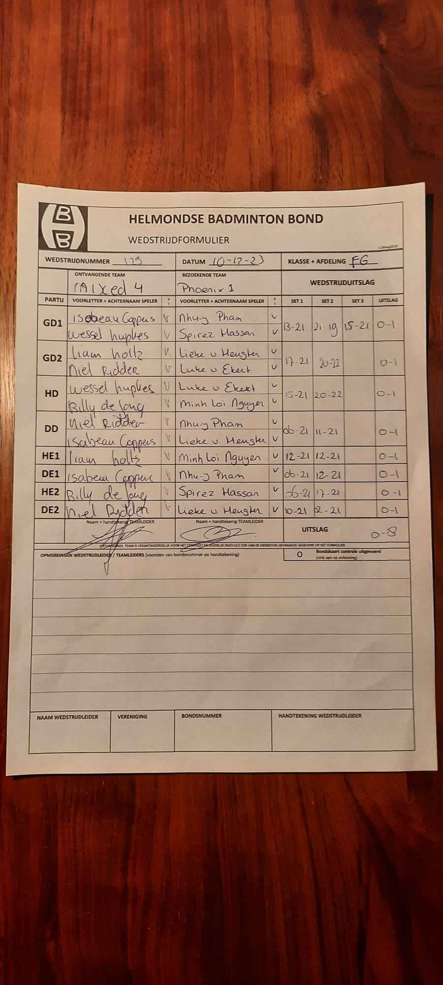 | 09:30 | zo. 10-12-2023 | Mixed 4 | - | Phoenix 1 | 15 | 0 - 8 | ||
