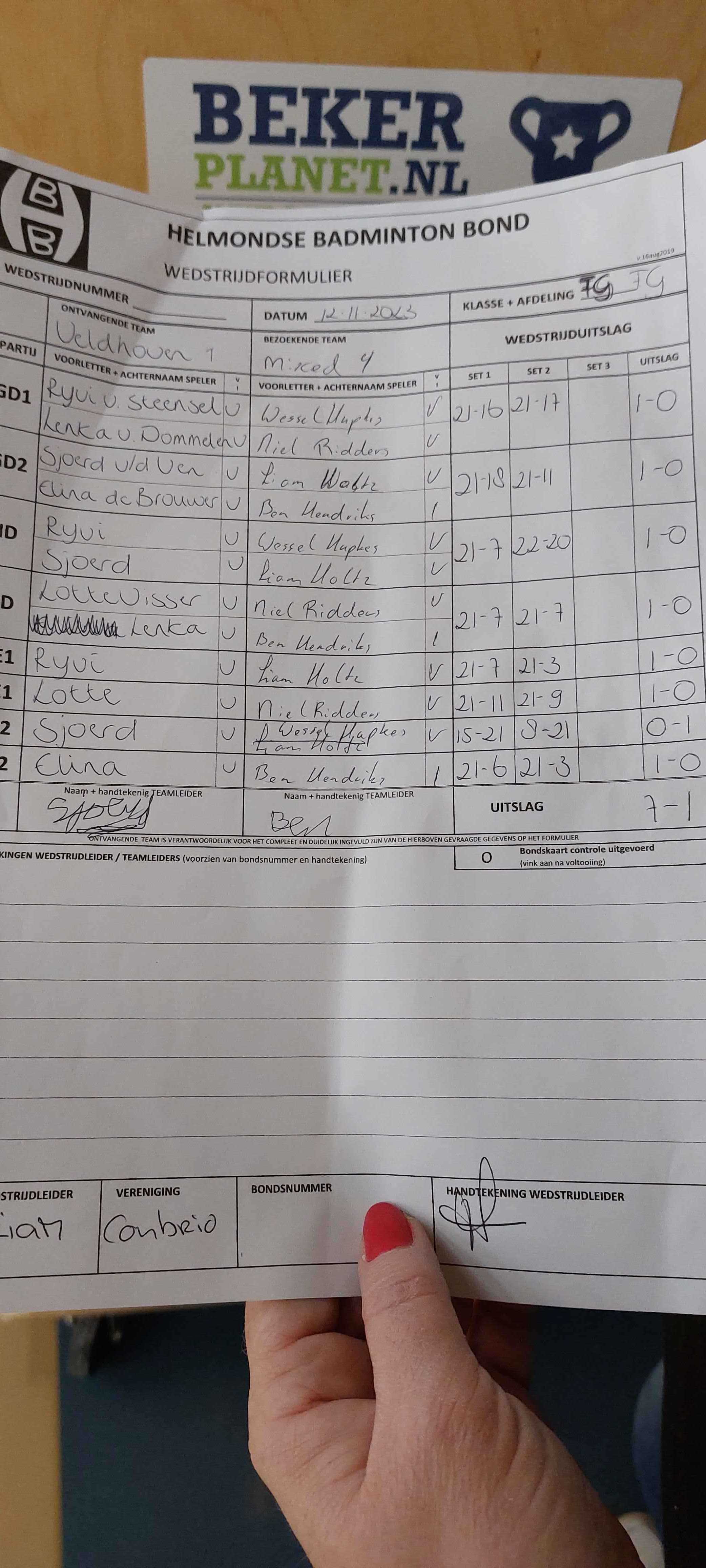 | 09:30 | zo. 12-11-2023 | Veldhoven 1 | - | Mixed 4 | 14 | 7 - 1 | ||