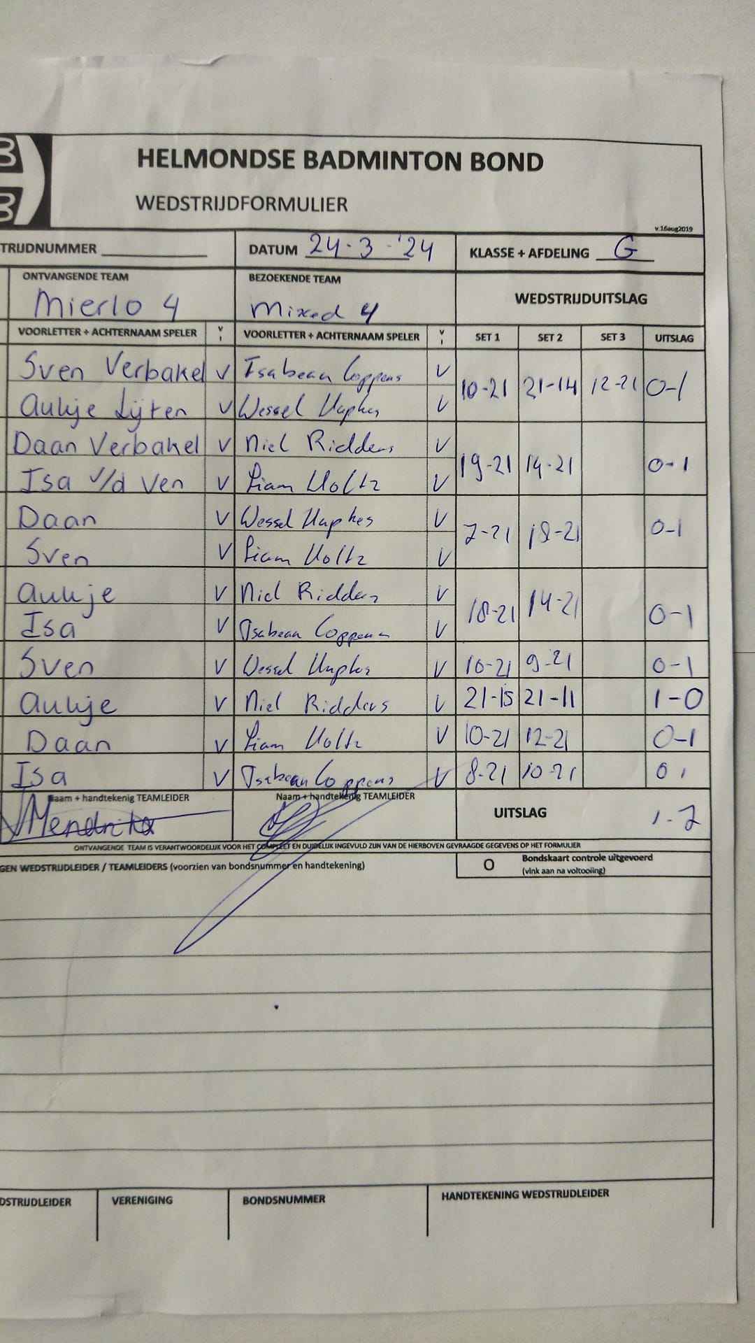 | 09:30 | zo. 24-03-2024 | Mierlo 4 | - | Mixed 4 | 4 | 1 - 7 | ||