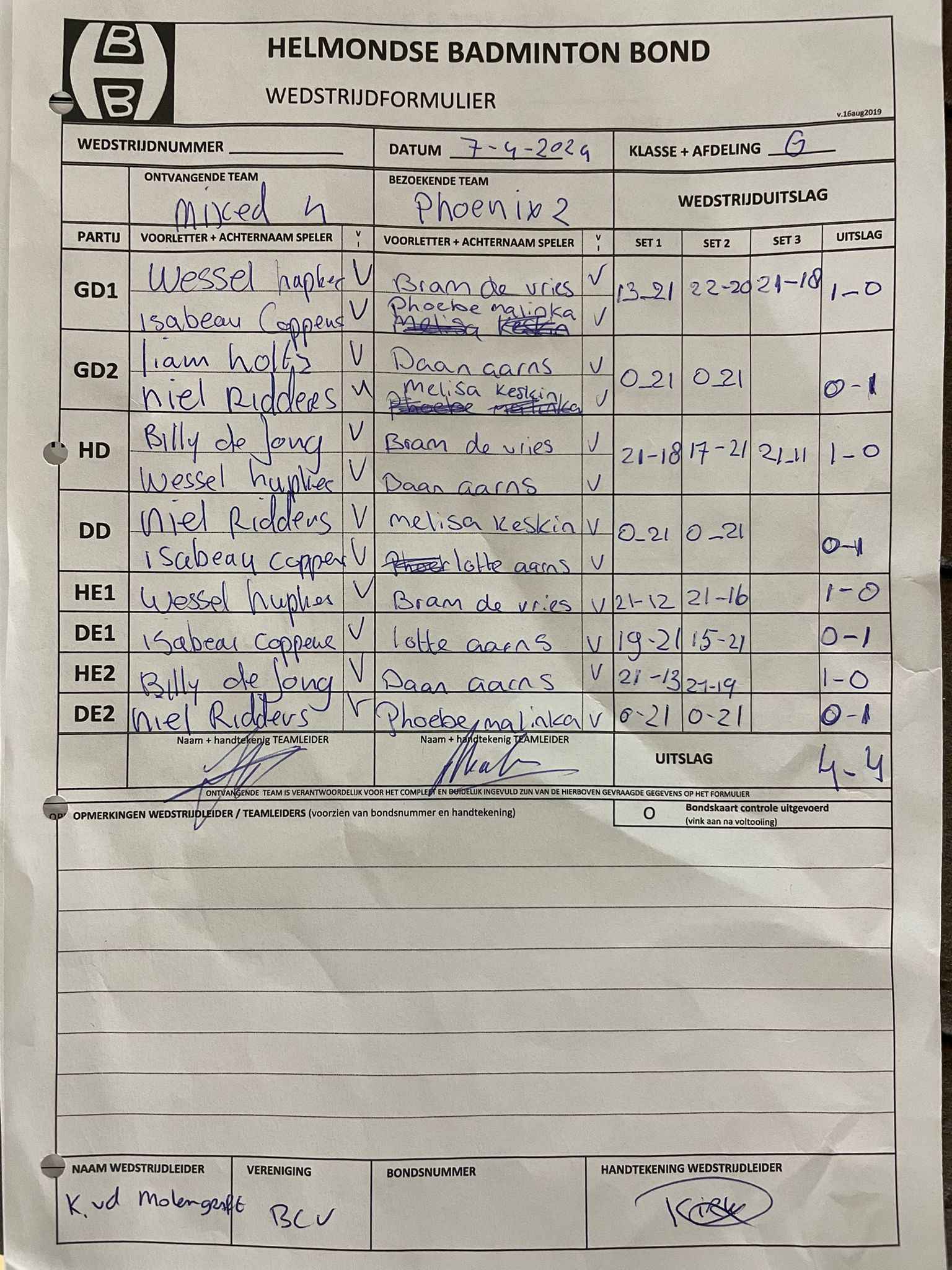 | 09:30 | zo. 07-04-2024 | Mixed 4 | - | Phoenix 2 | 14 | 4 - 4 | ||