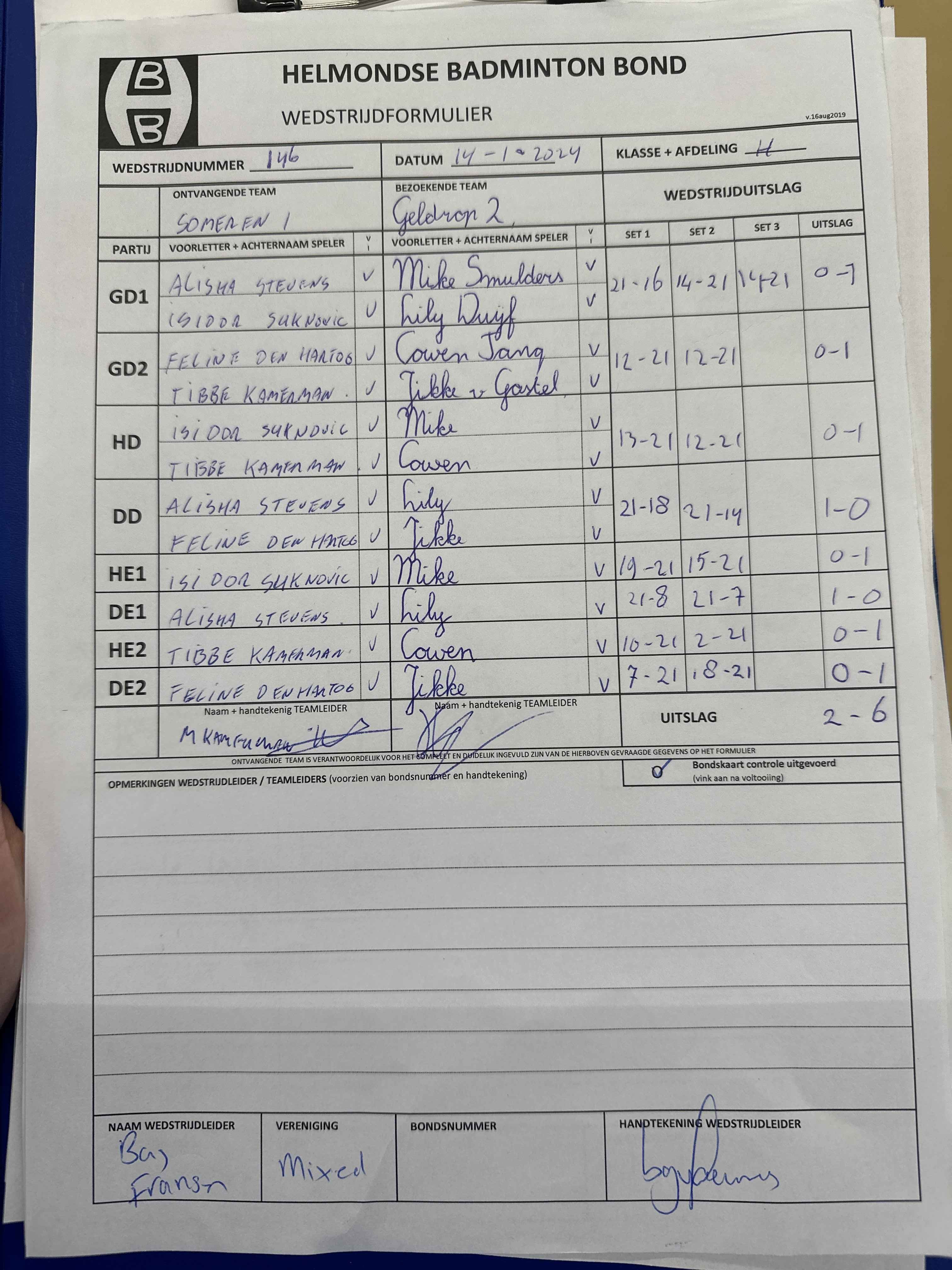 | 09:30 | zo. 14-01-2024 | Someren 1 | - | Geldrop 2 | 12 | 2 - 6 | ||