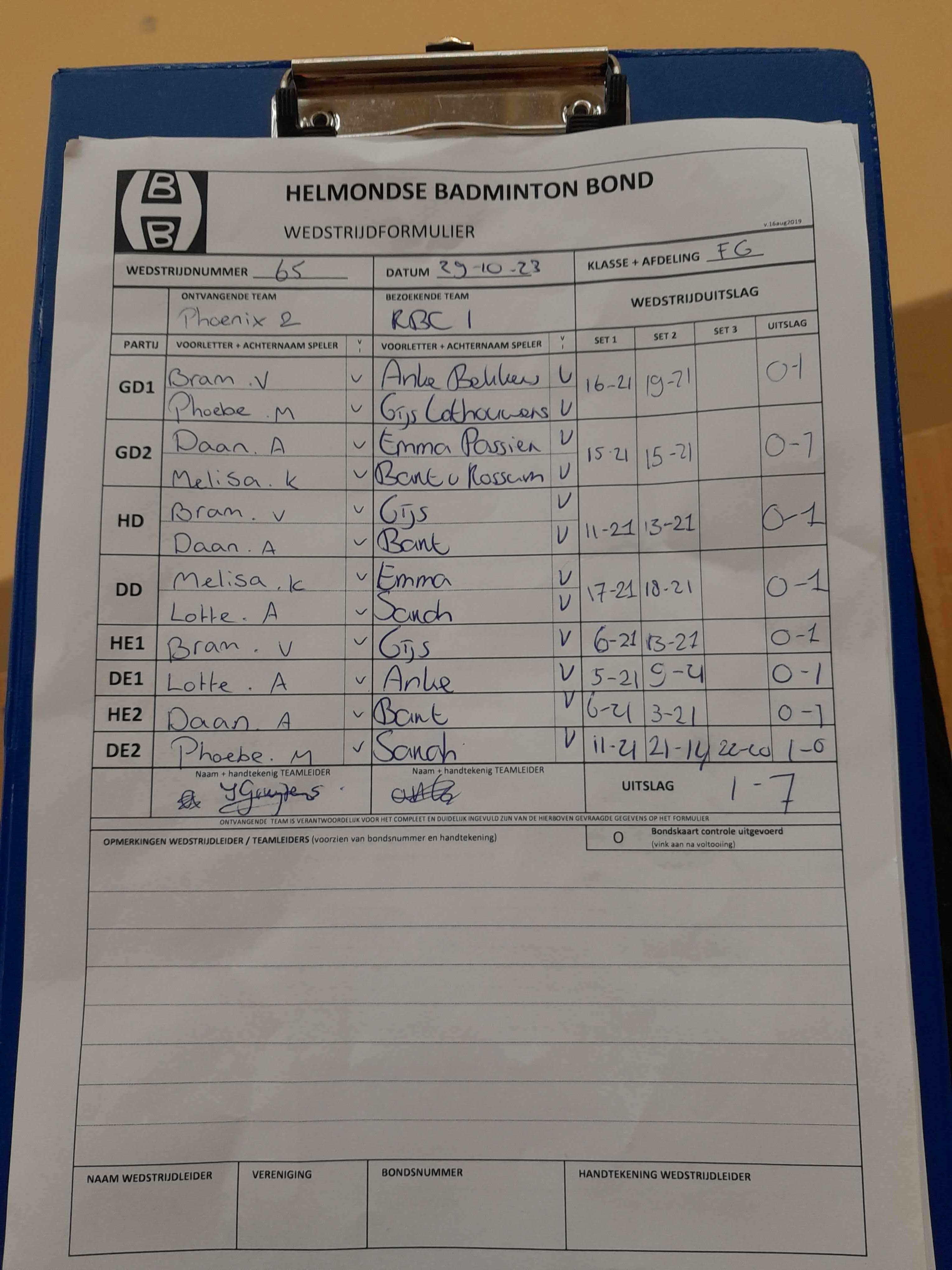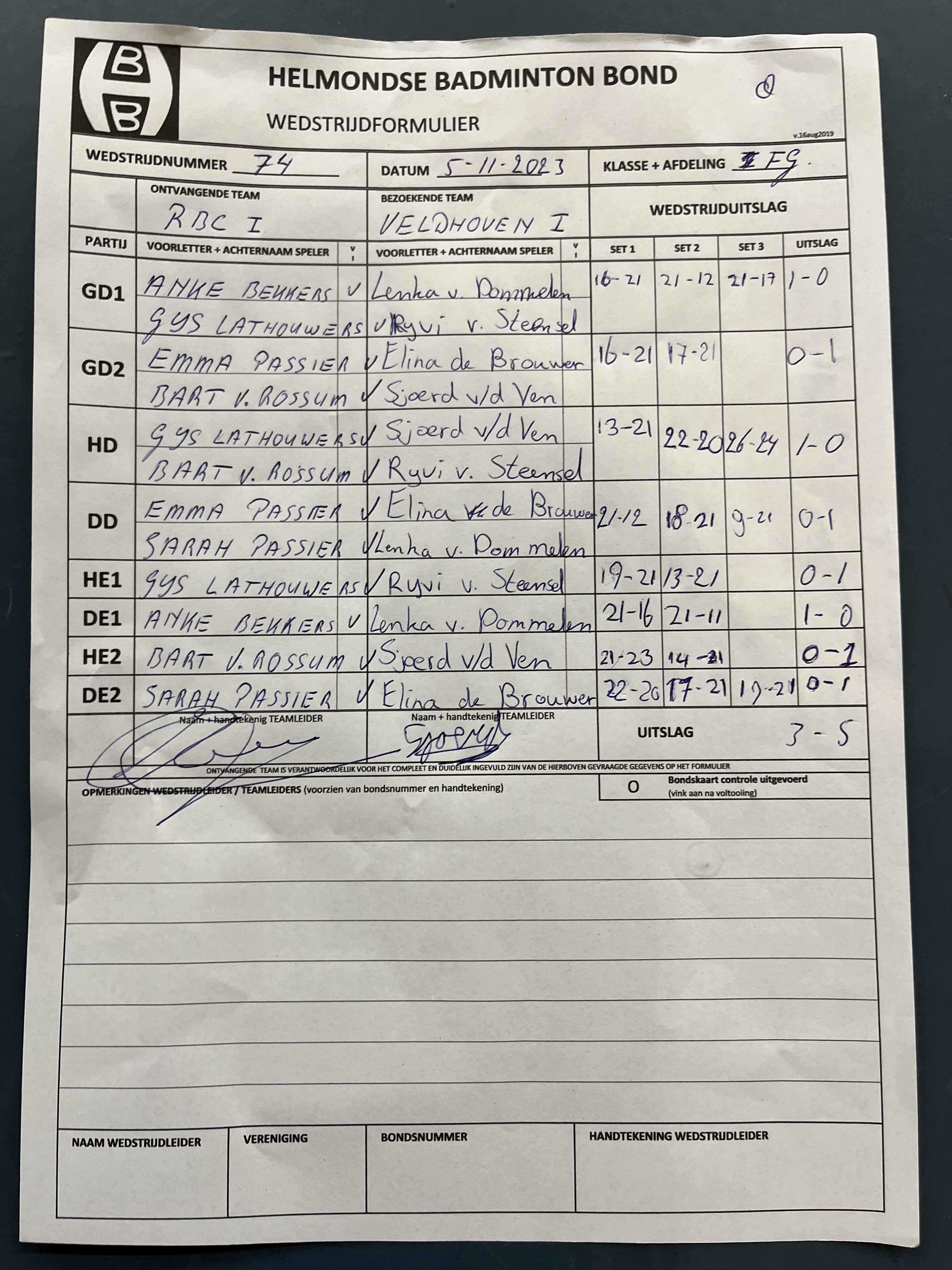 | 09:30 | zo. 05-11-2023 | RBC 1 | - | Veldhoven 1 | 12 | 3 - 5 | ||