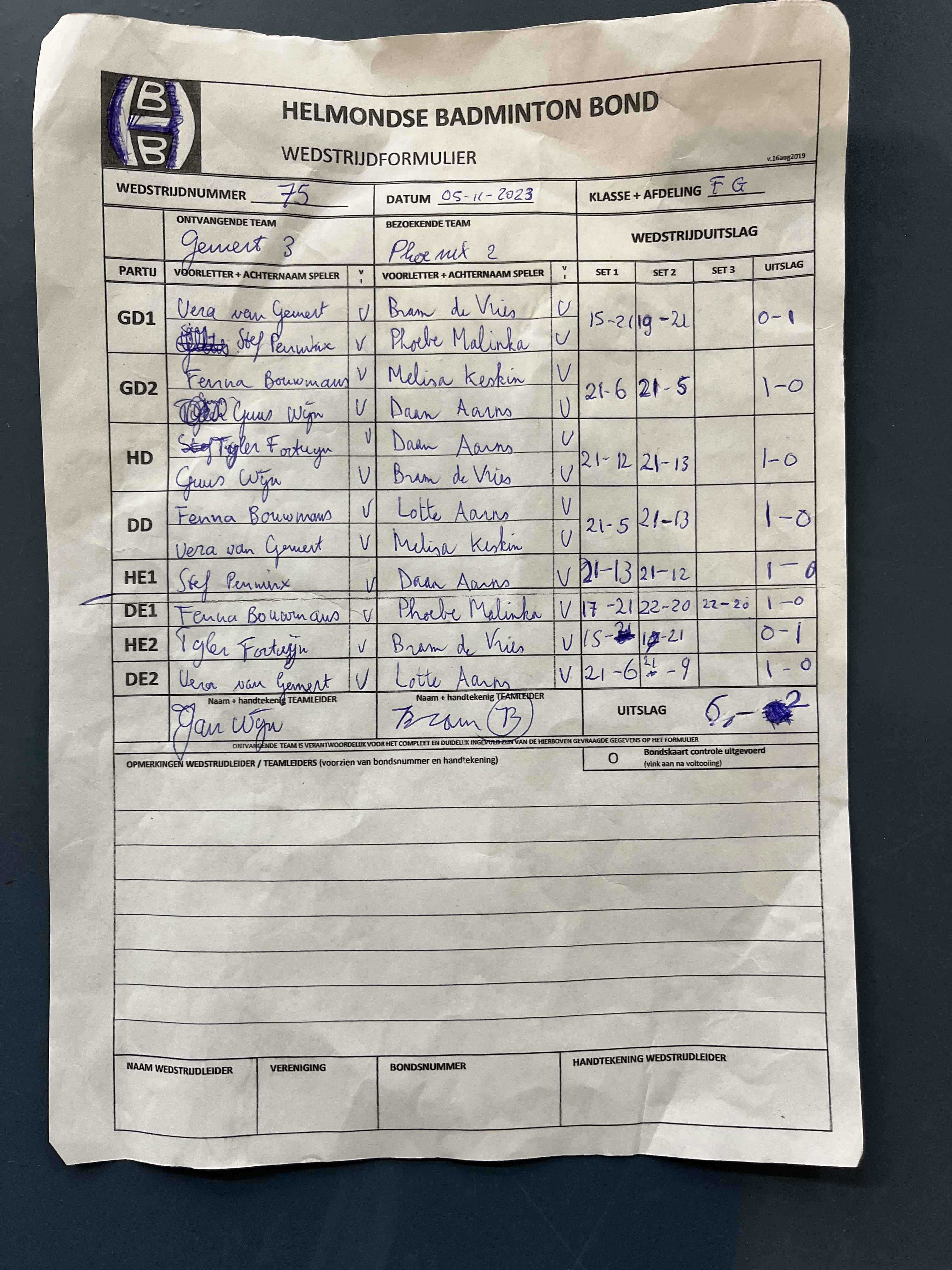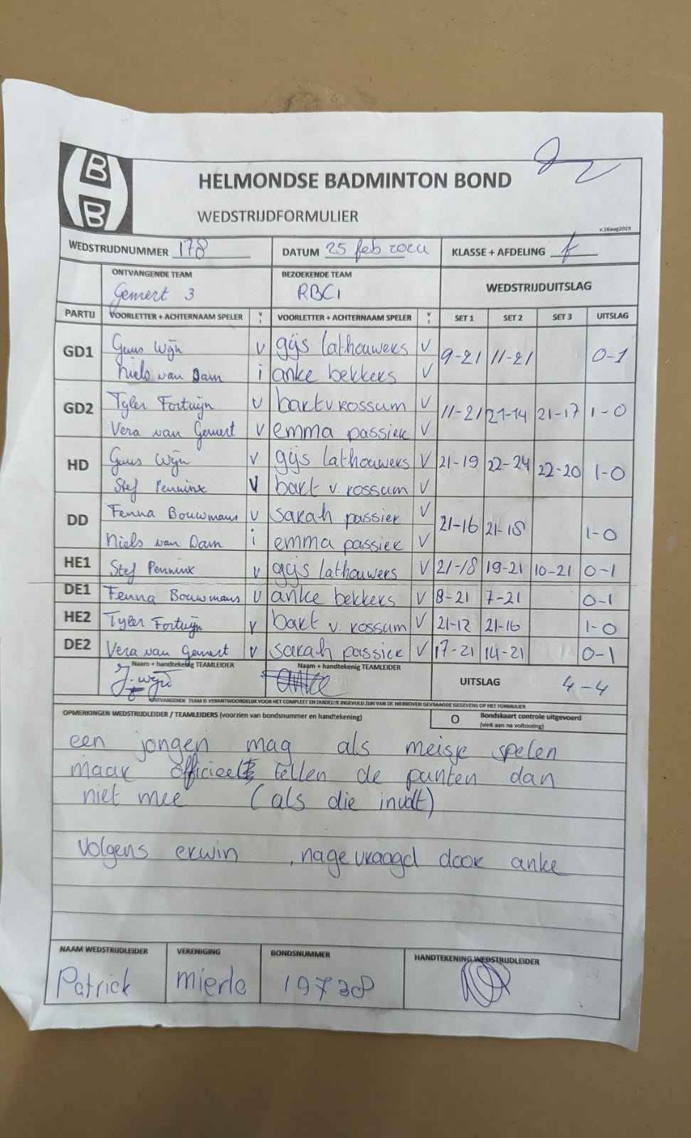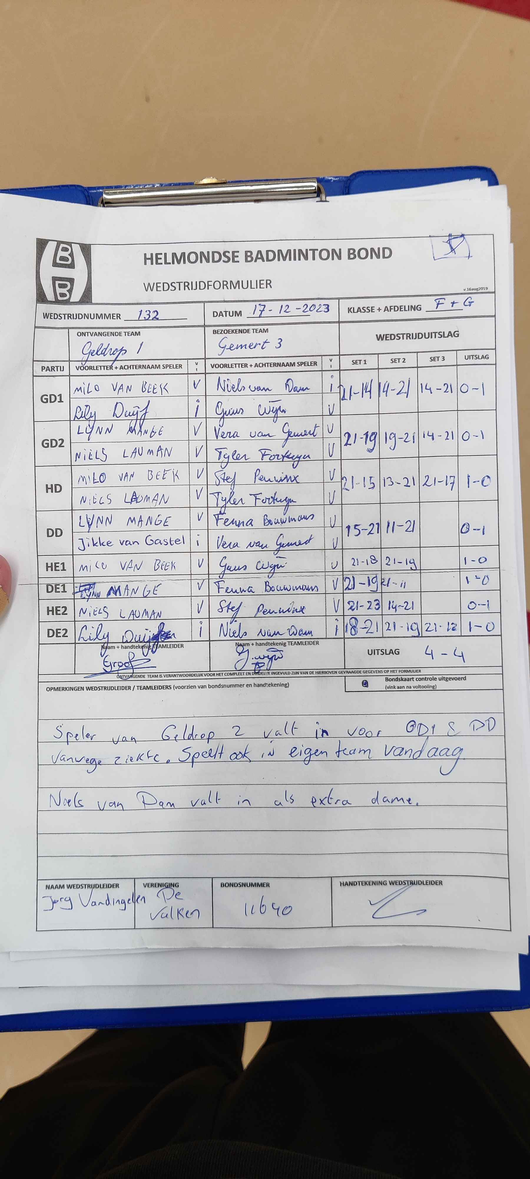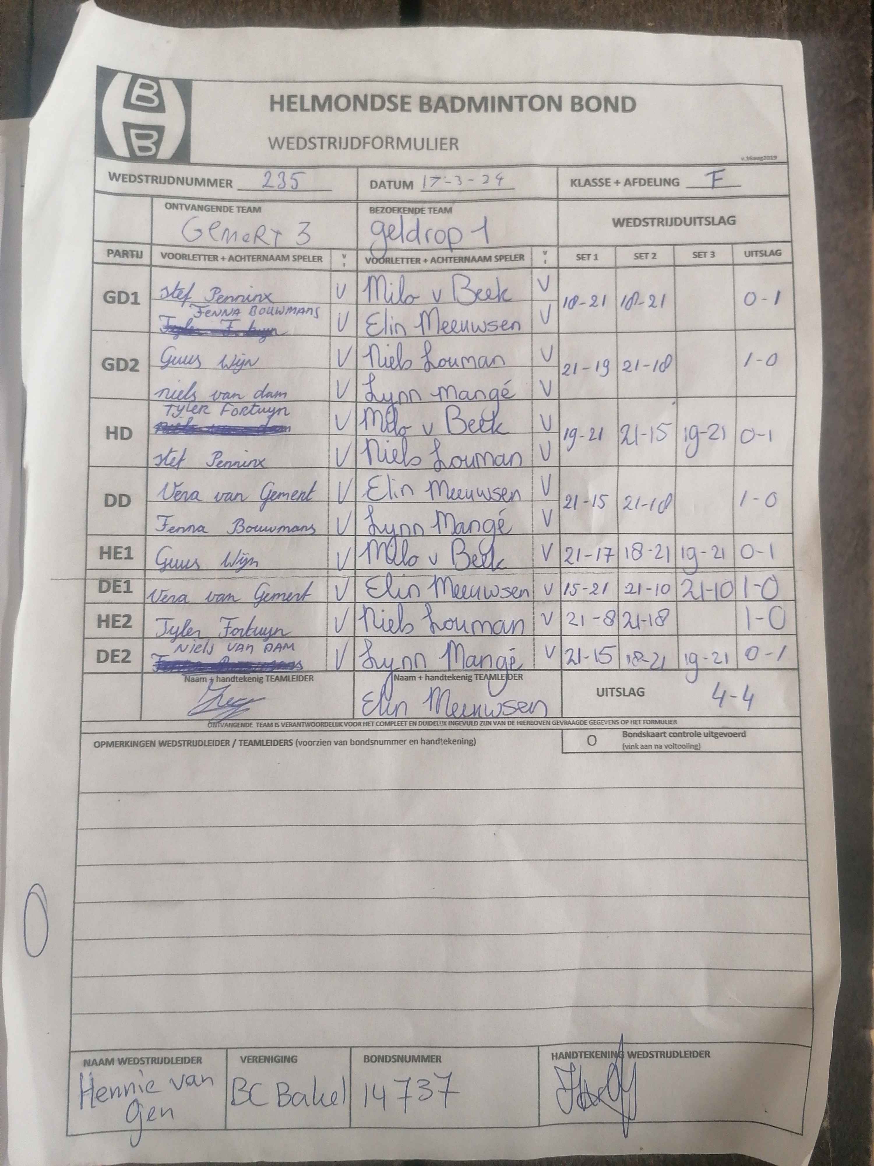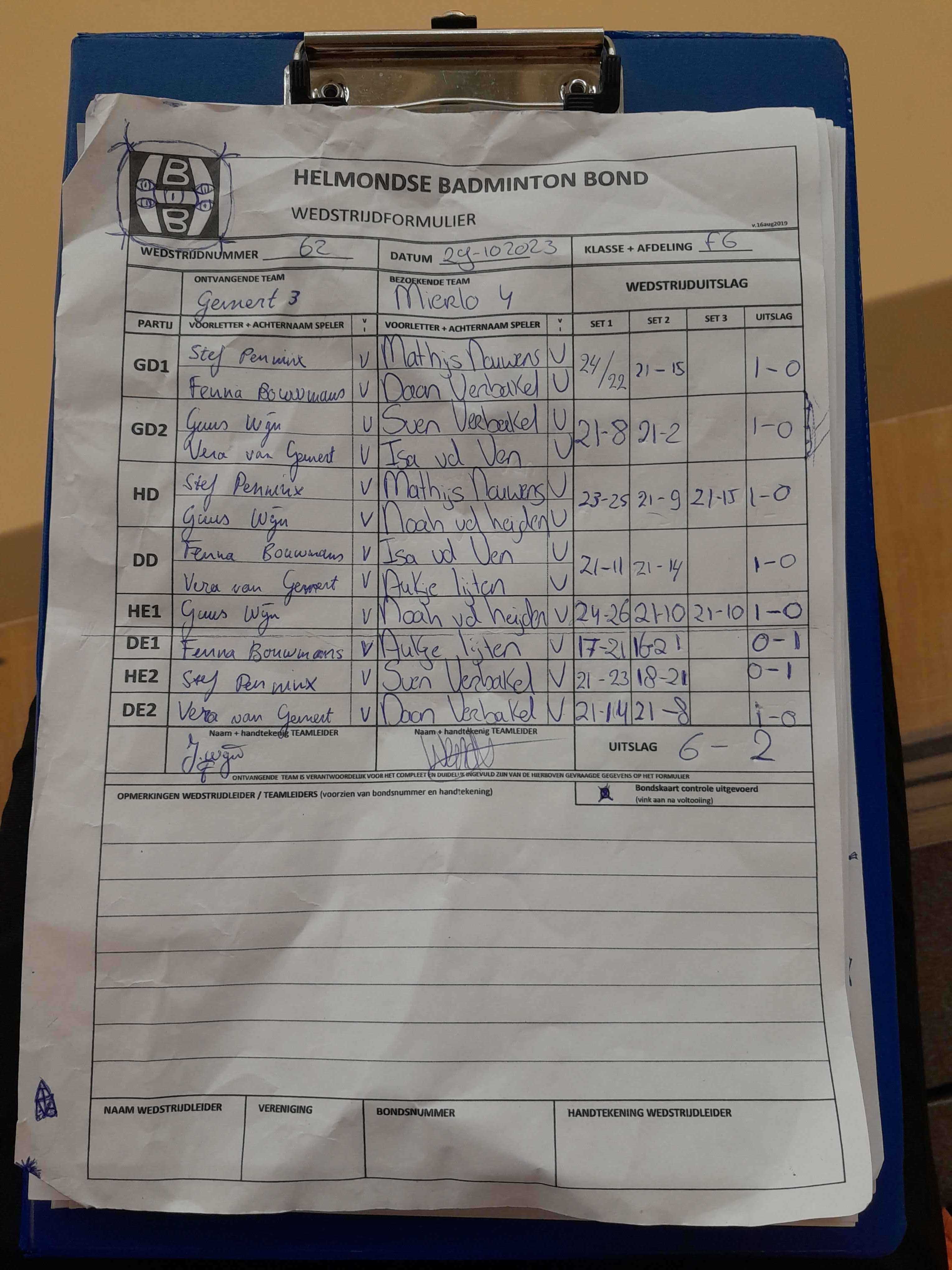 | 09:30 | zo. 26-11-2023 | Mixed 4 | - | Gemert 3 | 1 | 2 - 6 | ||