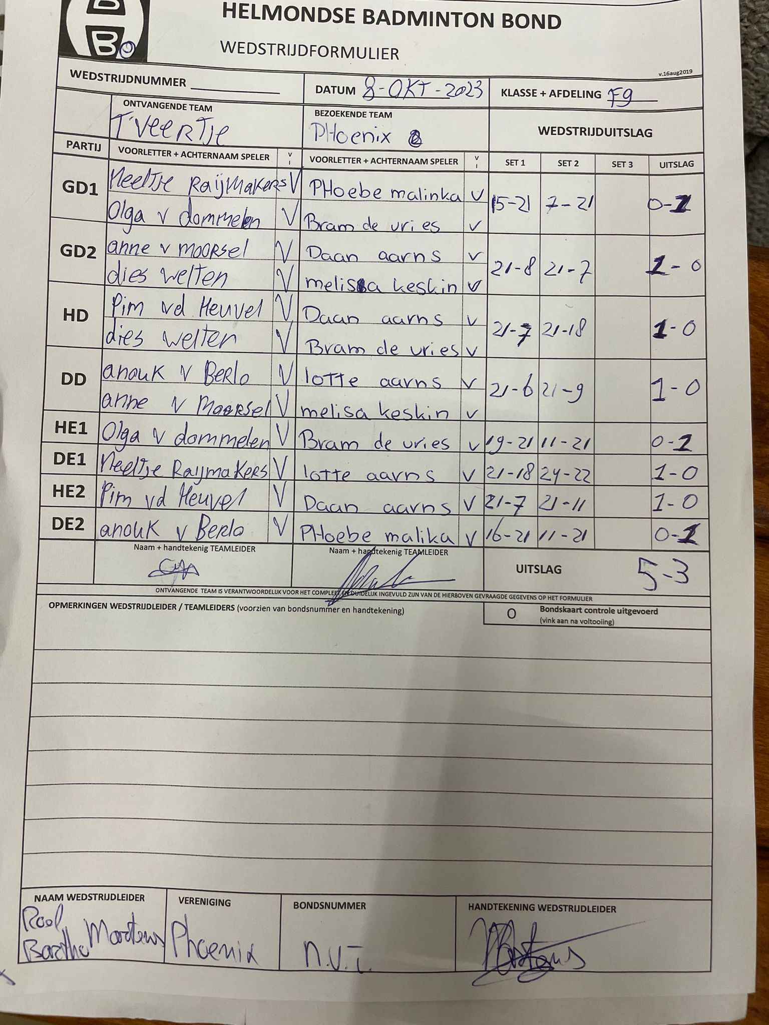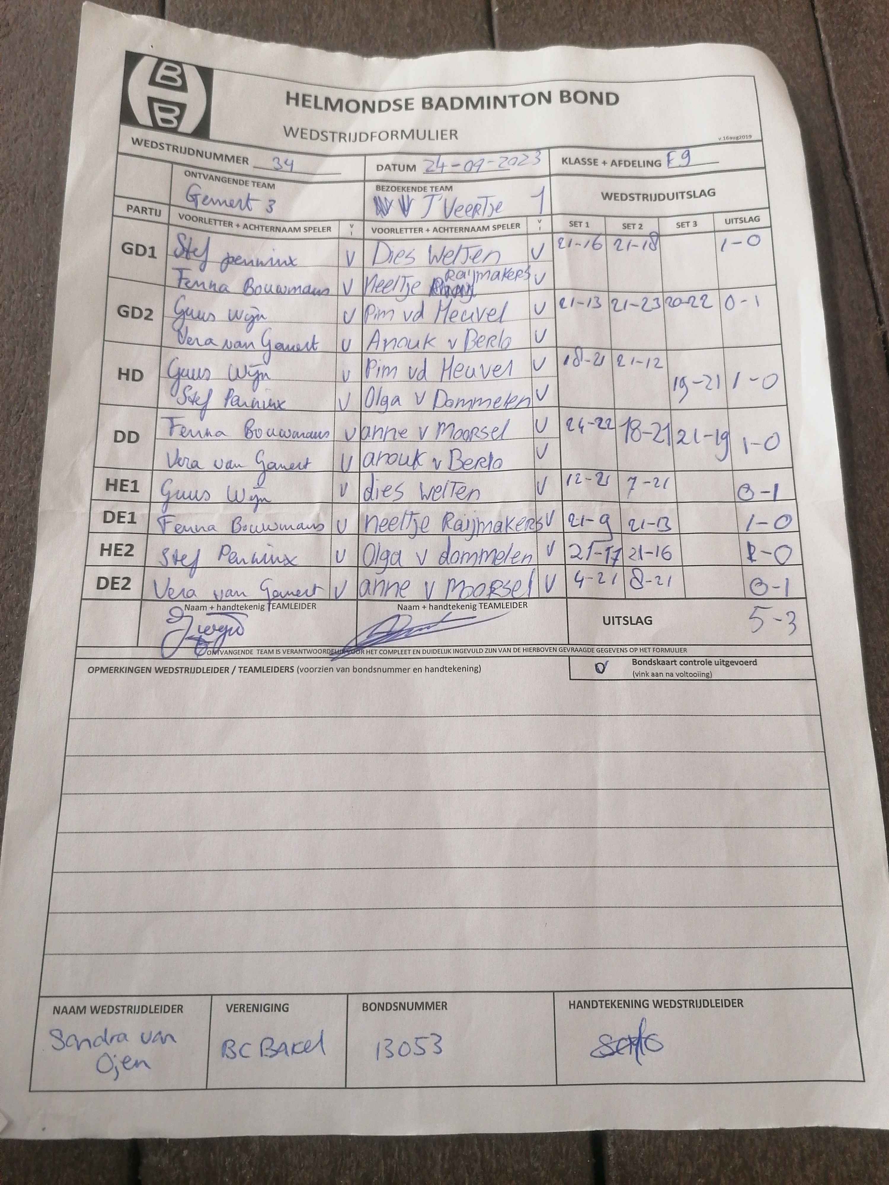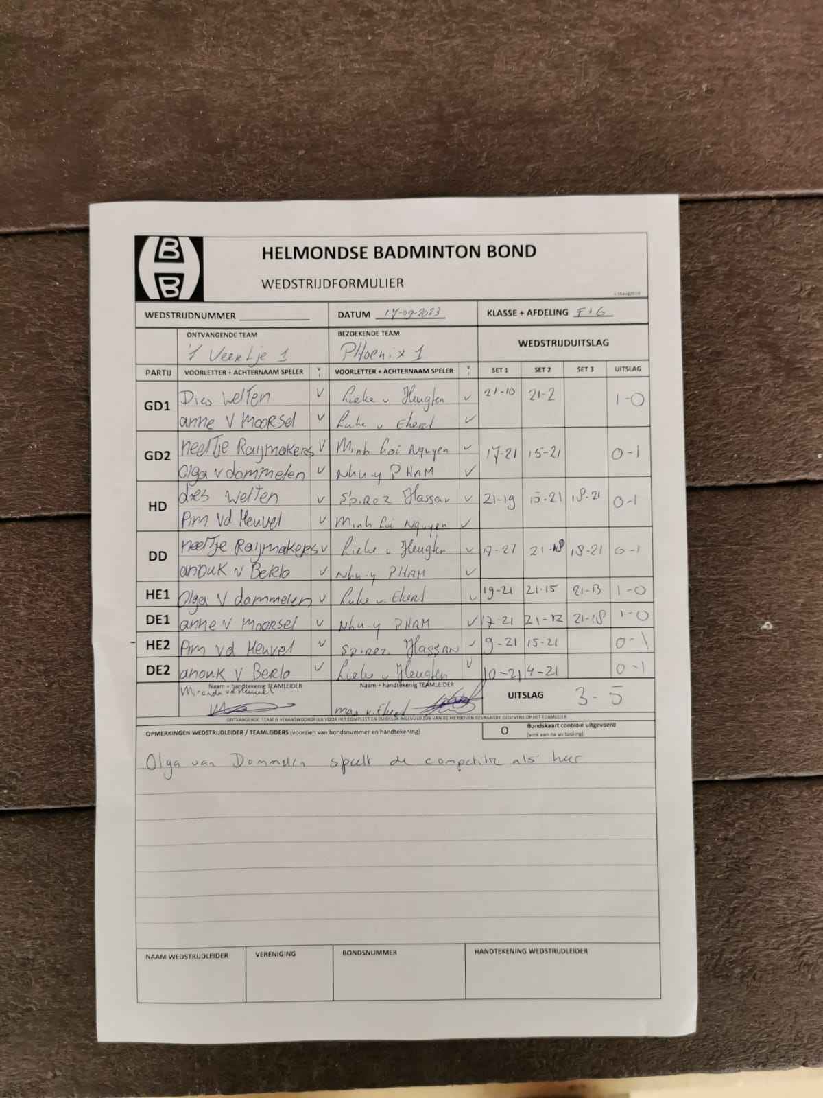 | 09:30 | zo. 10-09-2023 | 't Veertje 1 | - | Mixed 5 | 2 | 5 - 3 | ||