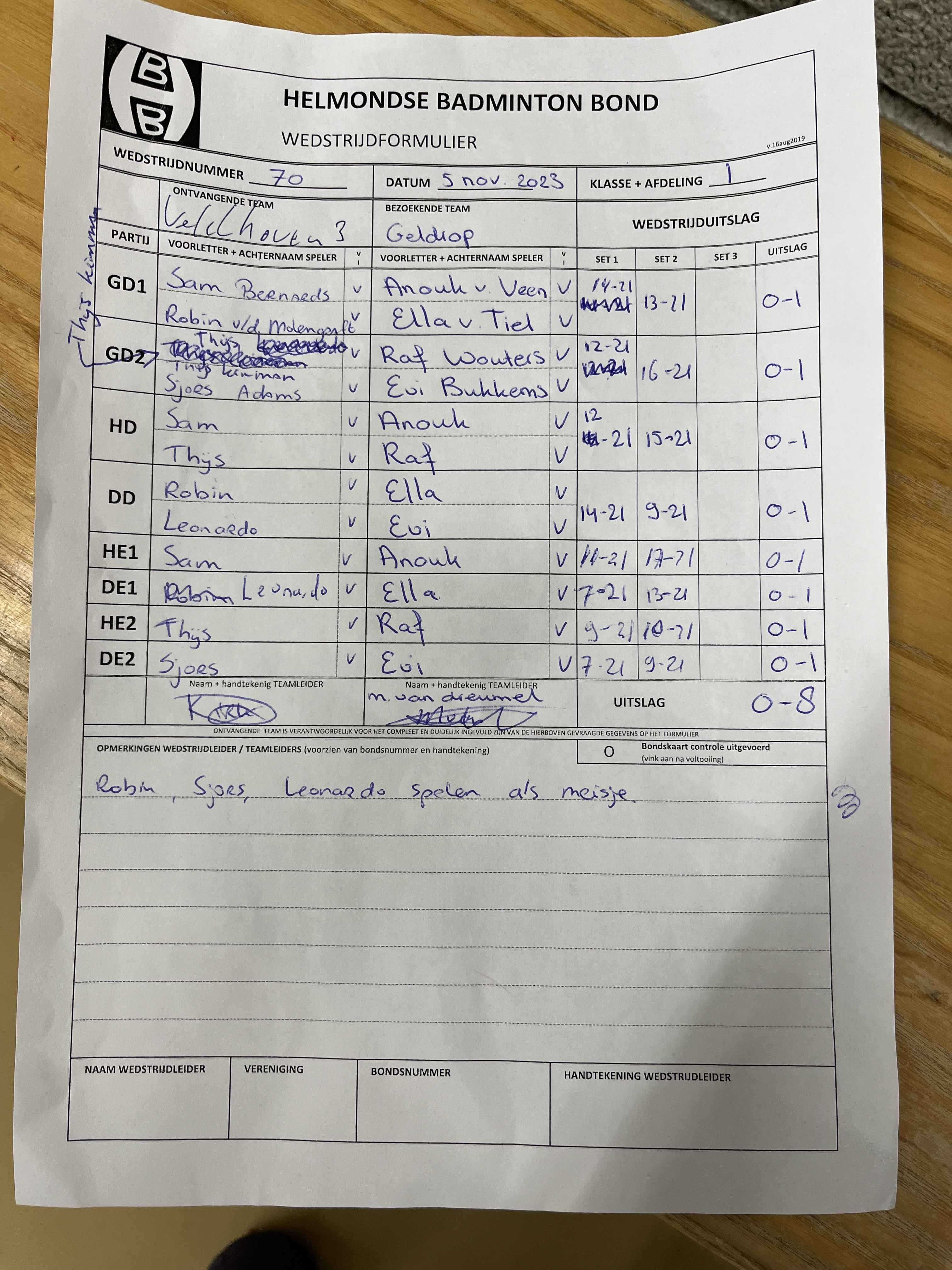 | 09:30 | zo. 05-11-2023 | Veldhoven 3 | - | Geldrop 3 | 4 | 0 - 8 | ||