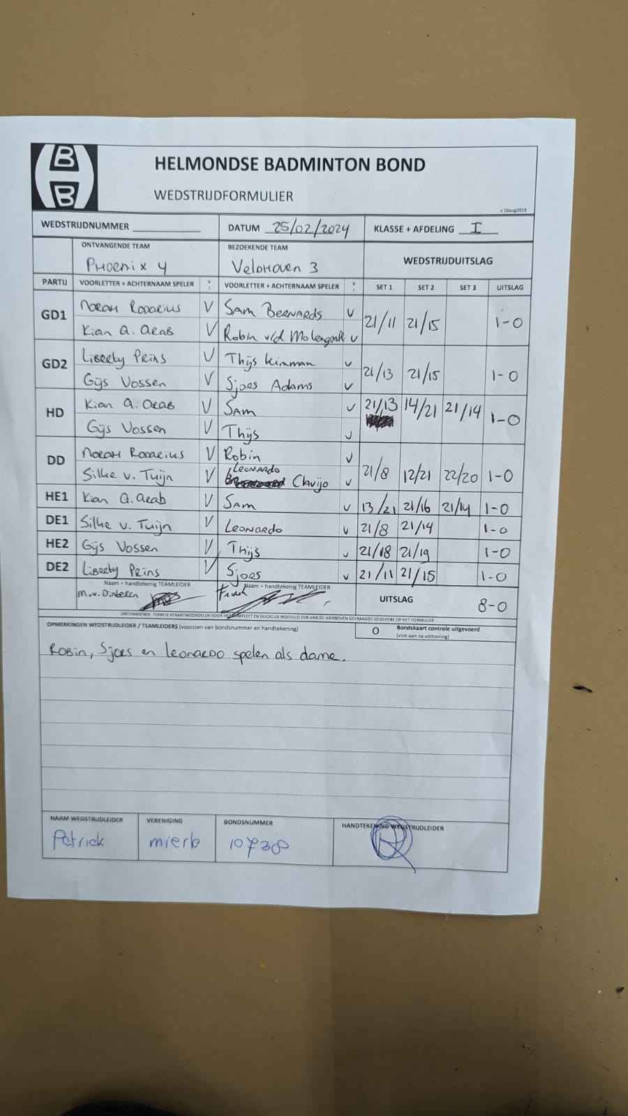 | 09:30 | zo. 25-02-2024 | Phoenix 4 | - | Veldhoven 3 | 3 | 8 - 0 | ||