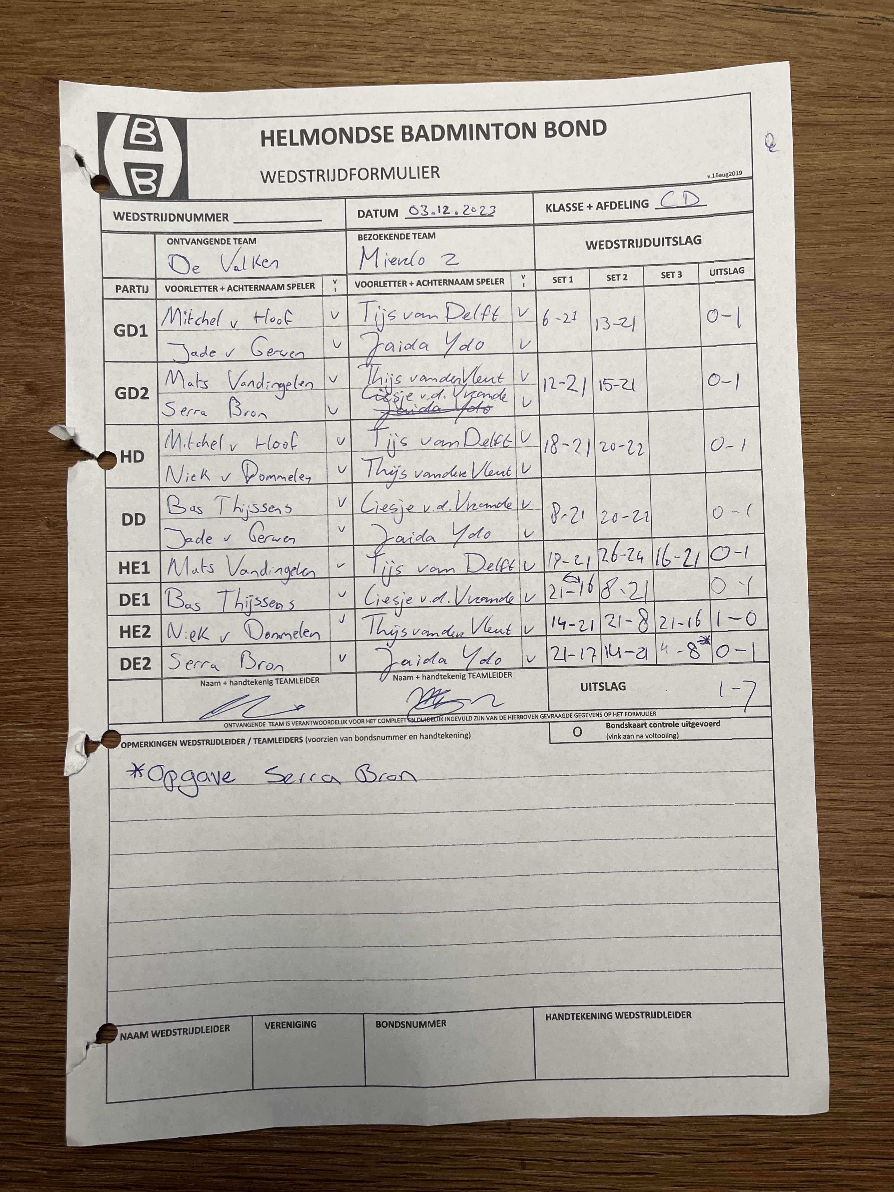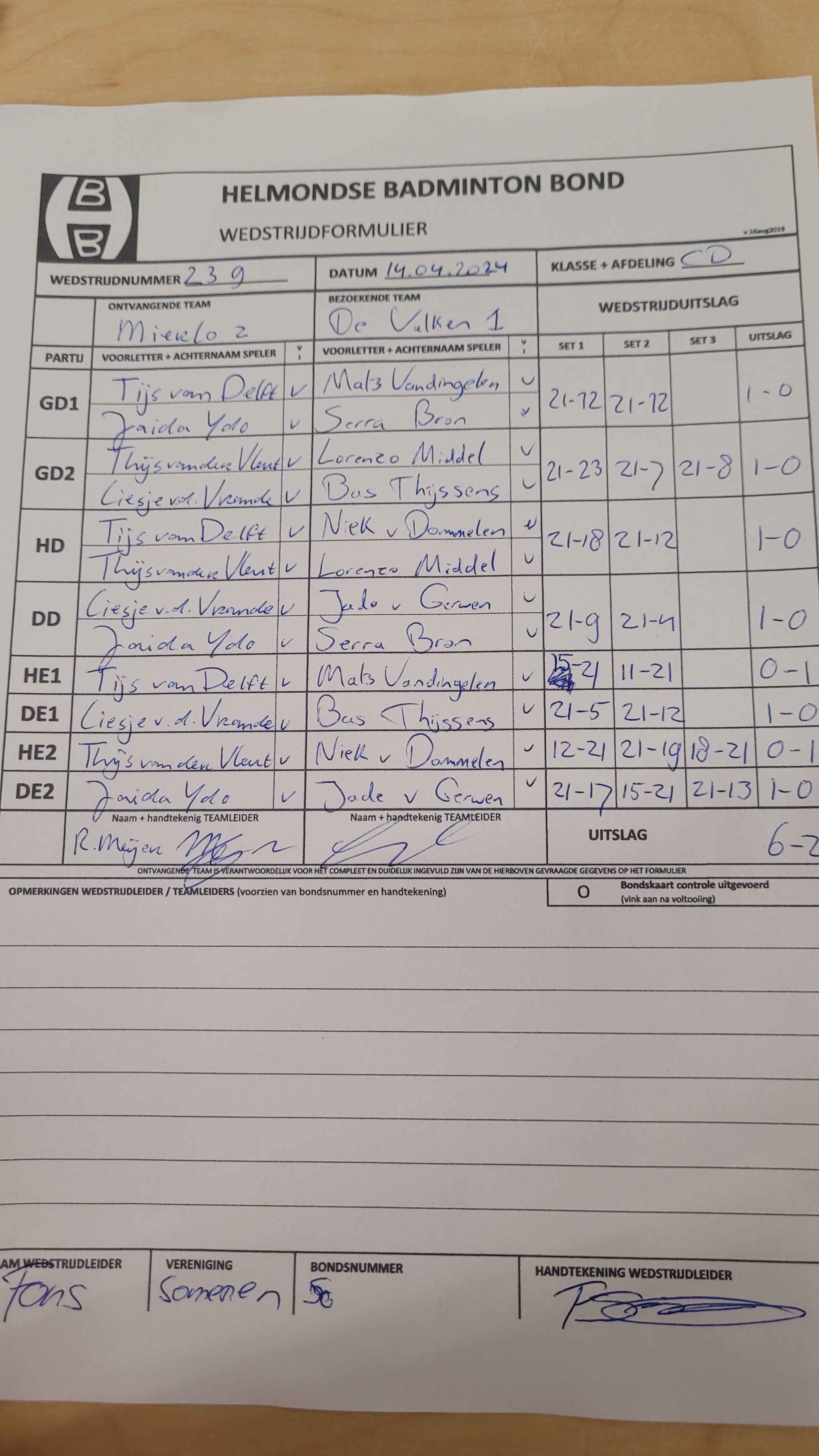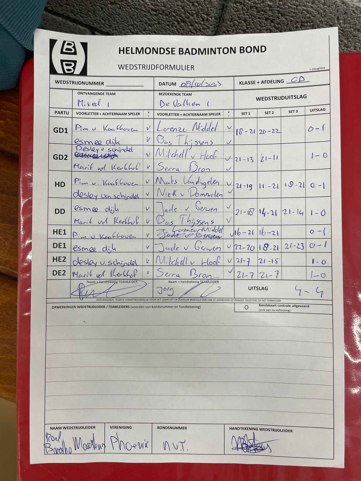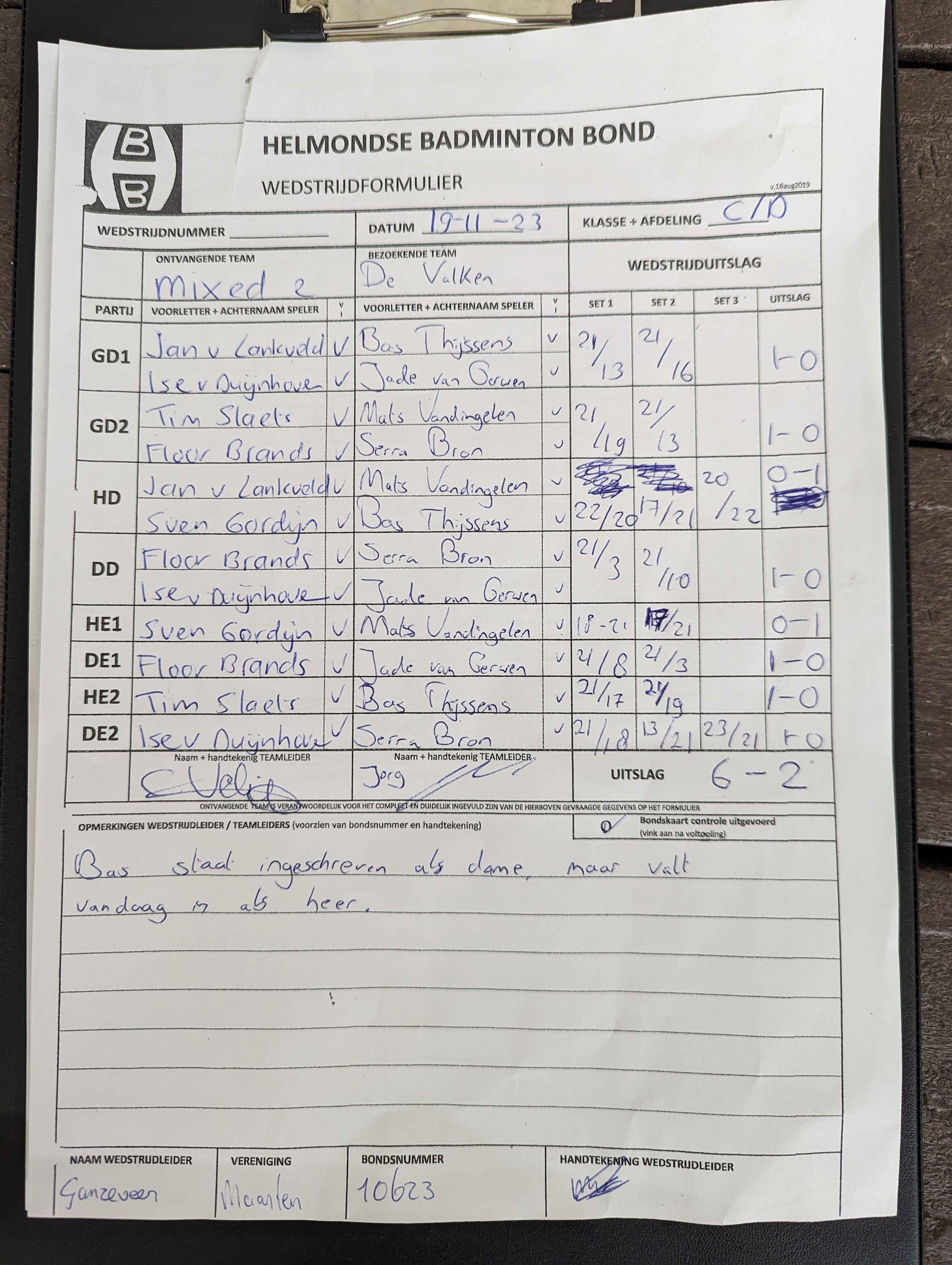 | 09:30 | zo. 19-11-2023 | Mixed 2 | - | De Valken 1 | 1 | 6 - 2 | ||