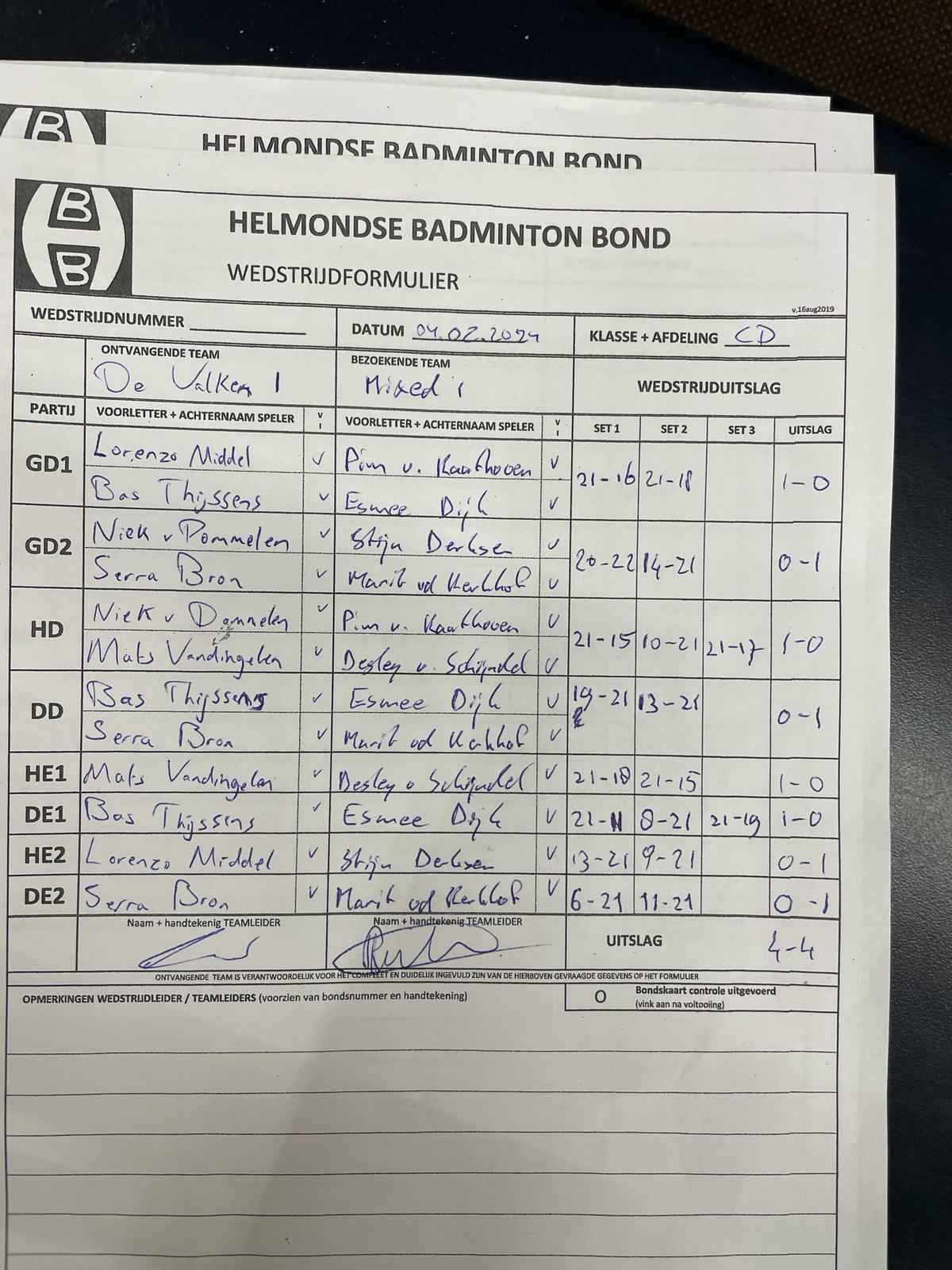 | 09:30 | zo. 04-02-2024 | De Valken 1 | - | Mixed 1 | 5 | 4 - 4 | ||