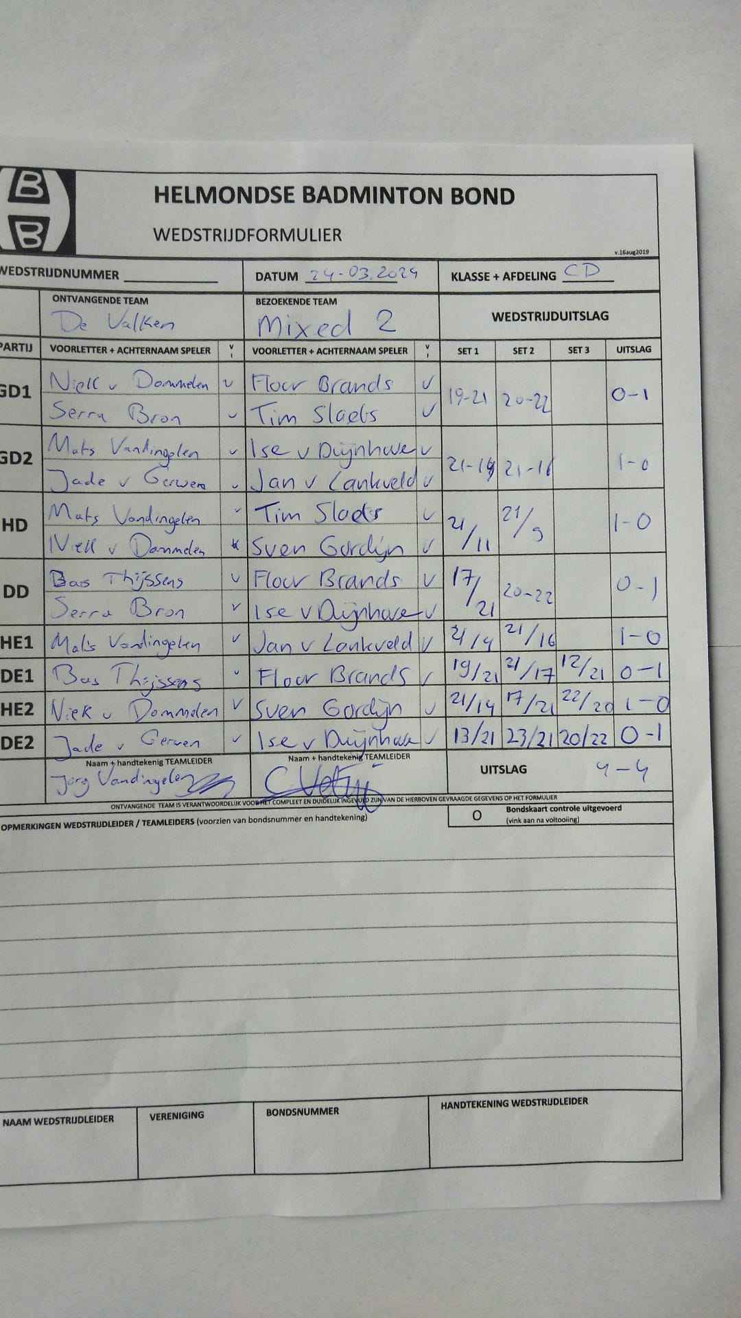 | 09:30 | zo. 24-03-2024 | De Valken 1 | - | Mixed 2 | 14 | 4 - 4 | ||