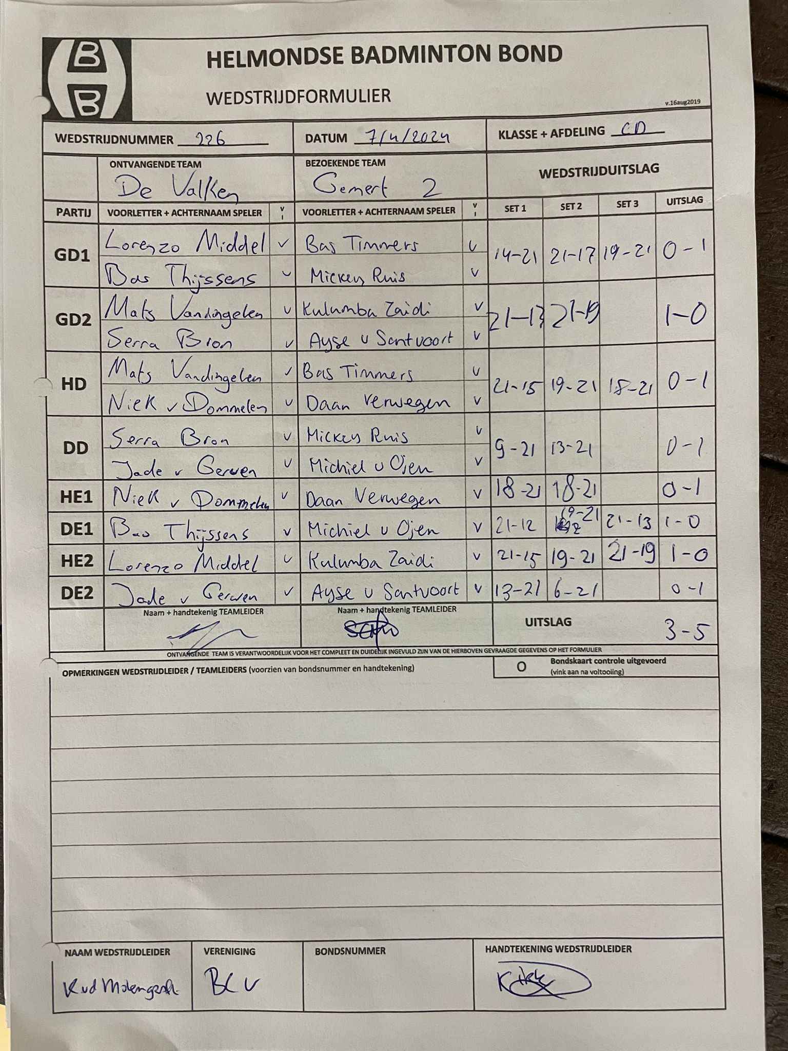 | 09:30 | zo. 07-04-2024 | De Valken 1 | - | Gemert 2 | 2 | 3 - 5 | ||
