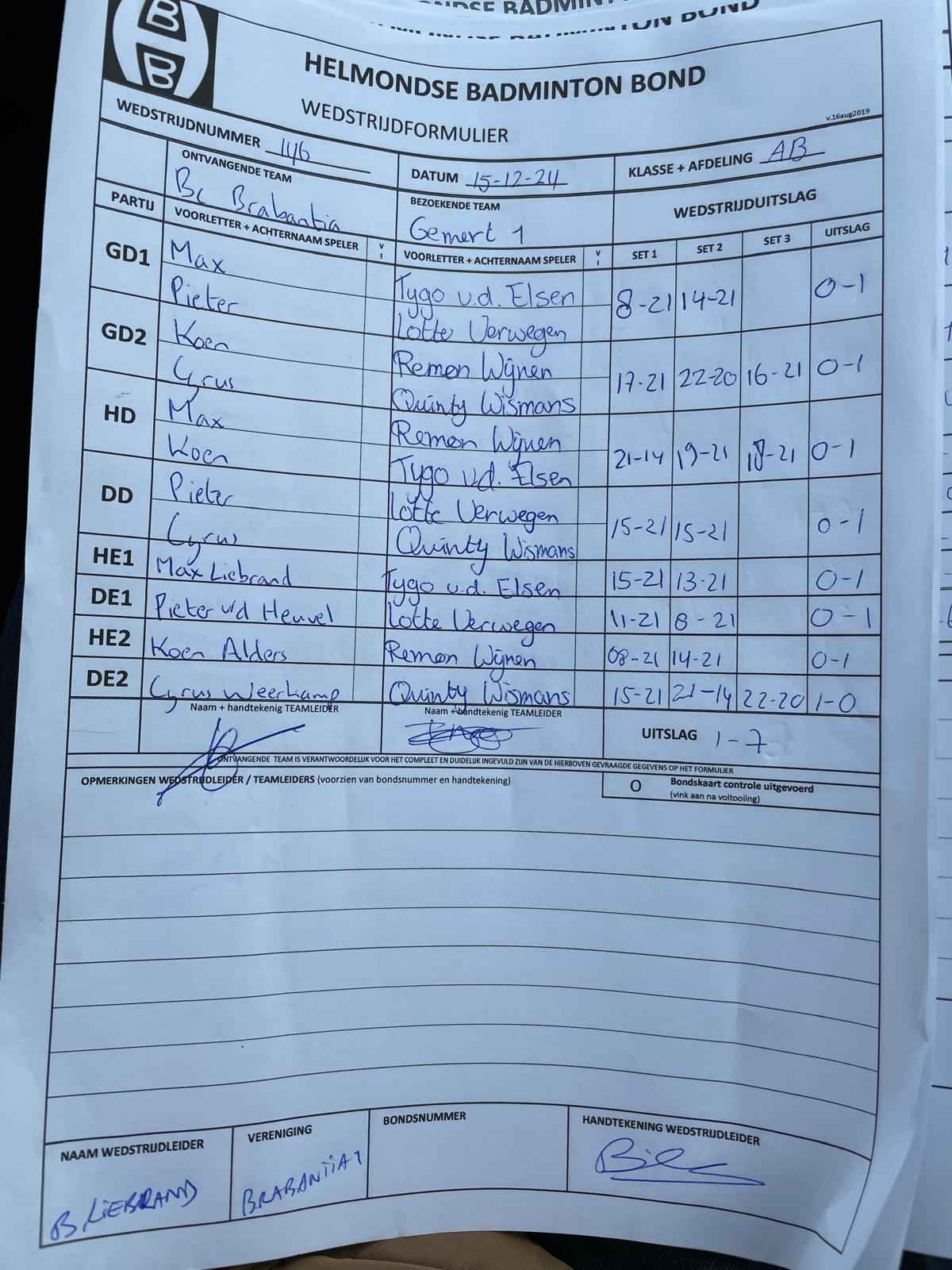 | 09:30 | zo. 15-12-2024 | Brabantia 1 | - | Gemert 1 | 4 | 1 - 7 | ||