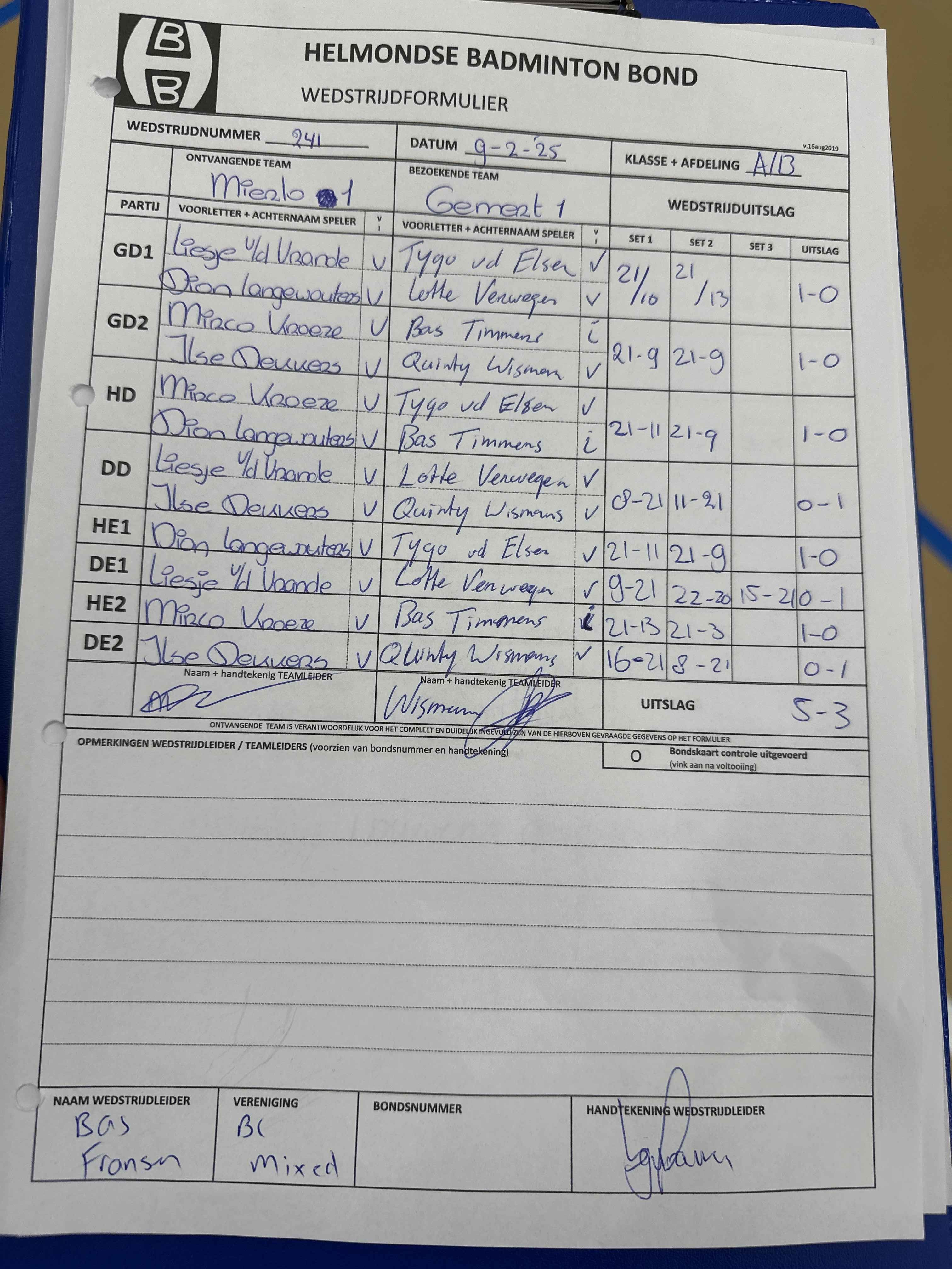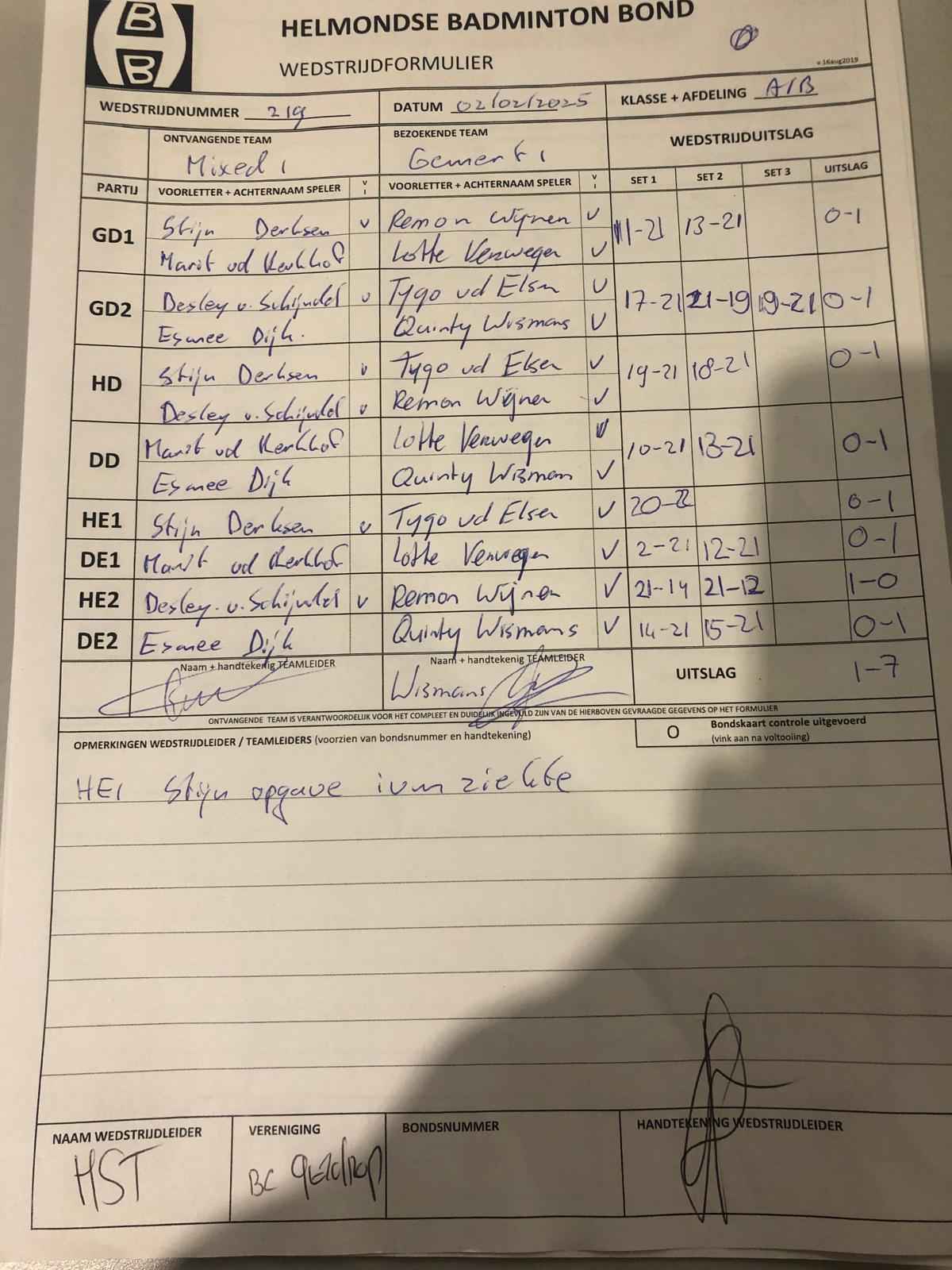 | 12:30 | zo. 02-02-2025 | Mixed 1 | - | Gemert 1 | 1 | 1 - 7 | ||