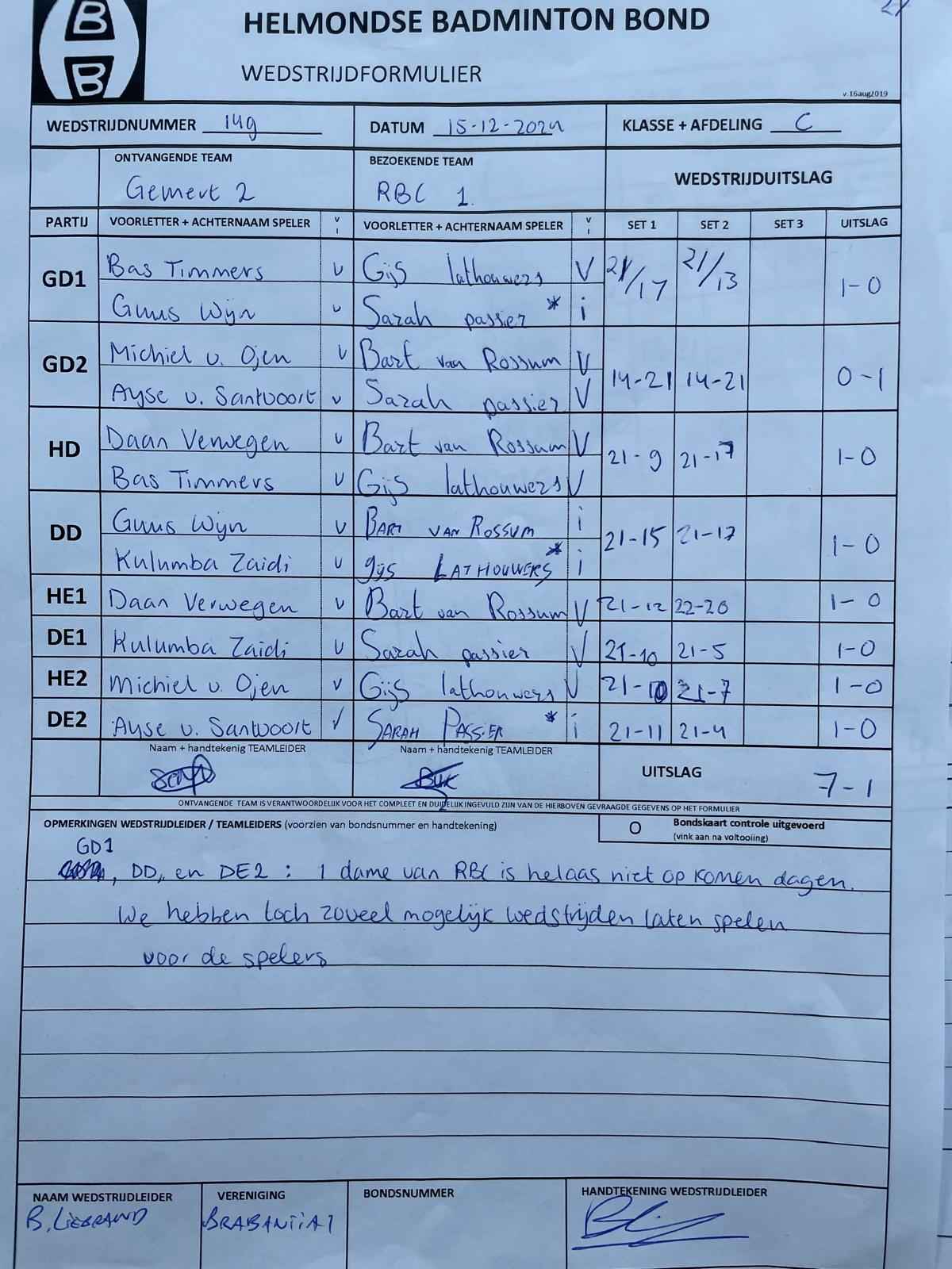 | 09:30 | zo. 15-12-2024 | Gemert 2 | - | RBC 1 | 2 | 7 - 1 | ||