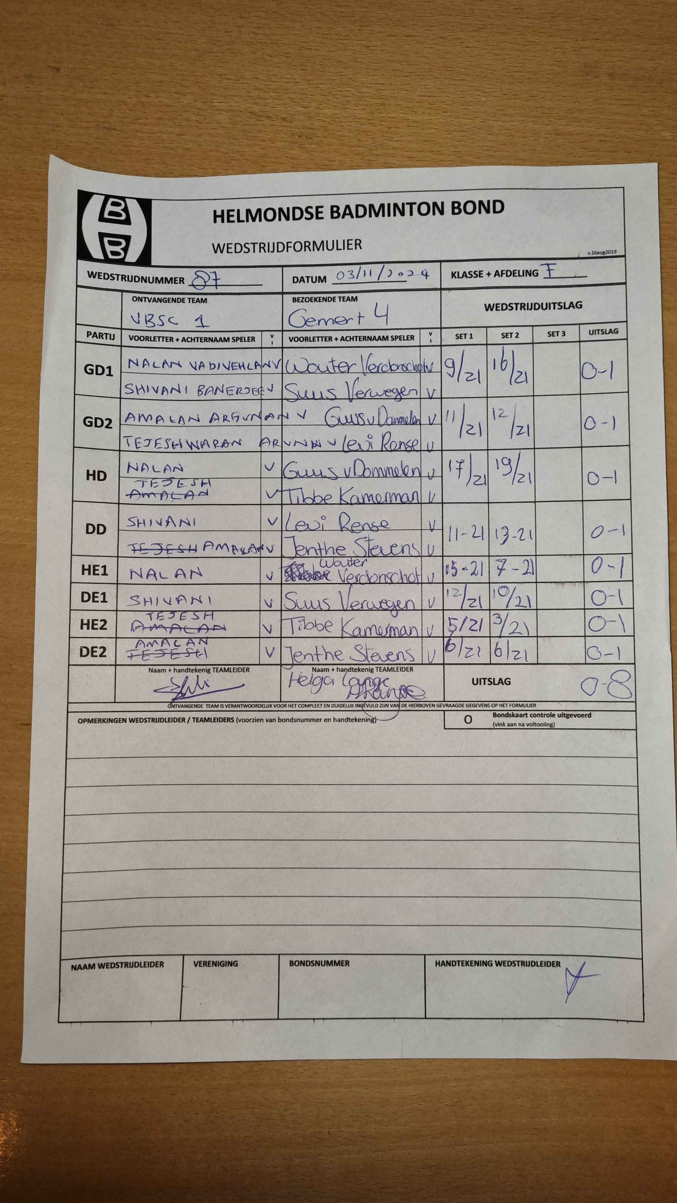 | 09:30 | zo. 03-11-2024 | VBSC 1 | - | Gemert 4 | 14 | 0 - 8 | ||