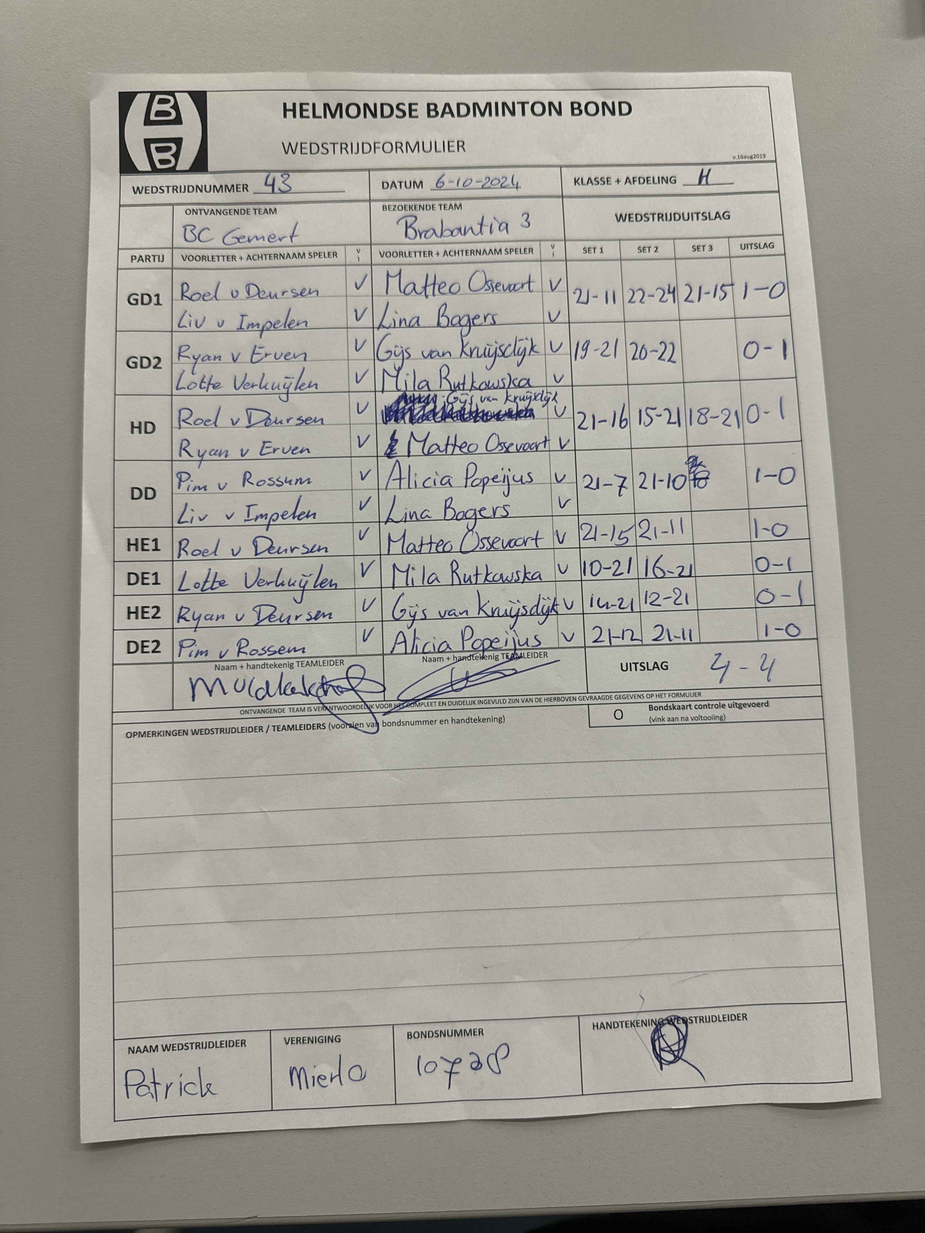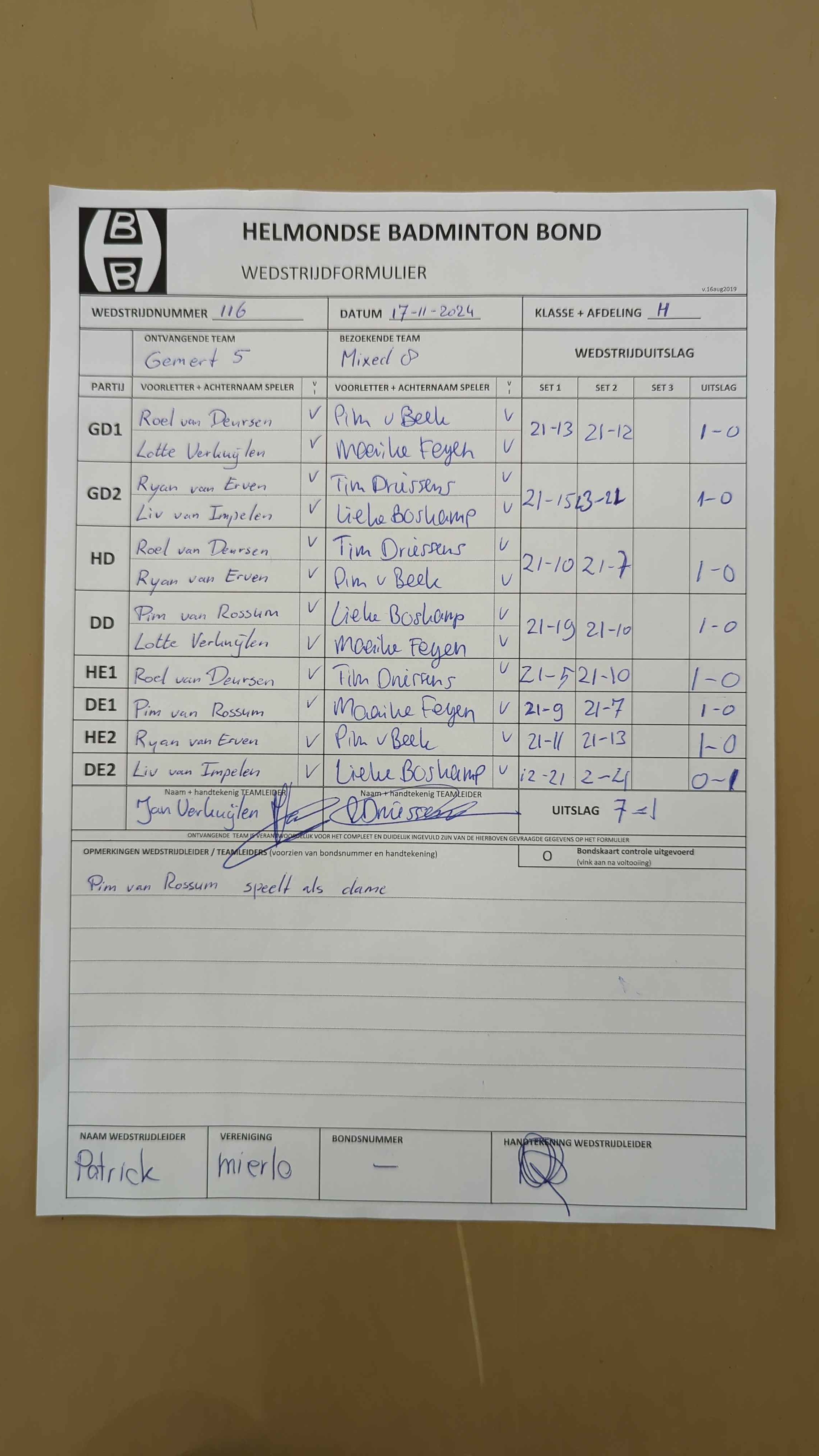 | 12:30 | zo. 17-11-2024 | Gemert 5 | - | Mixed 8 | 13 | 7 - 1 | ||