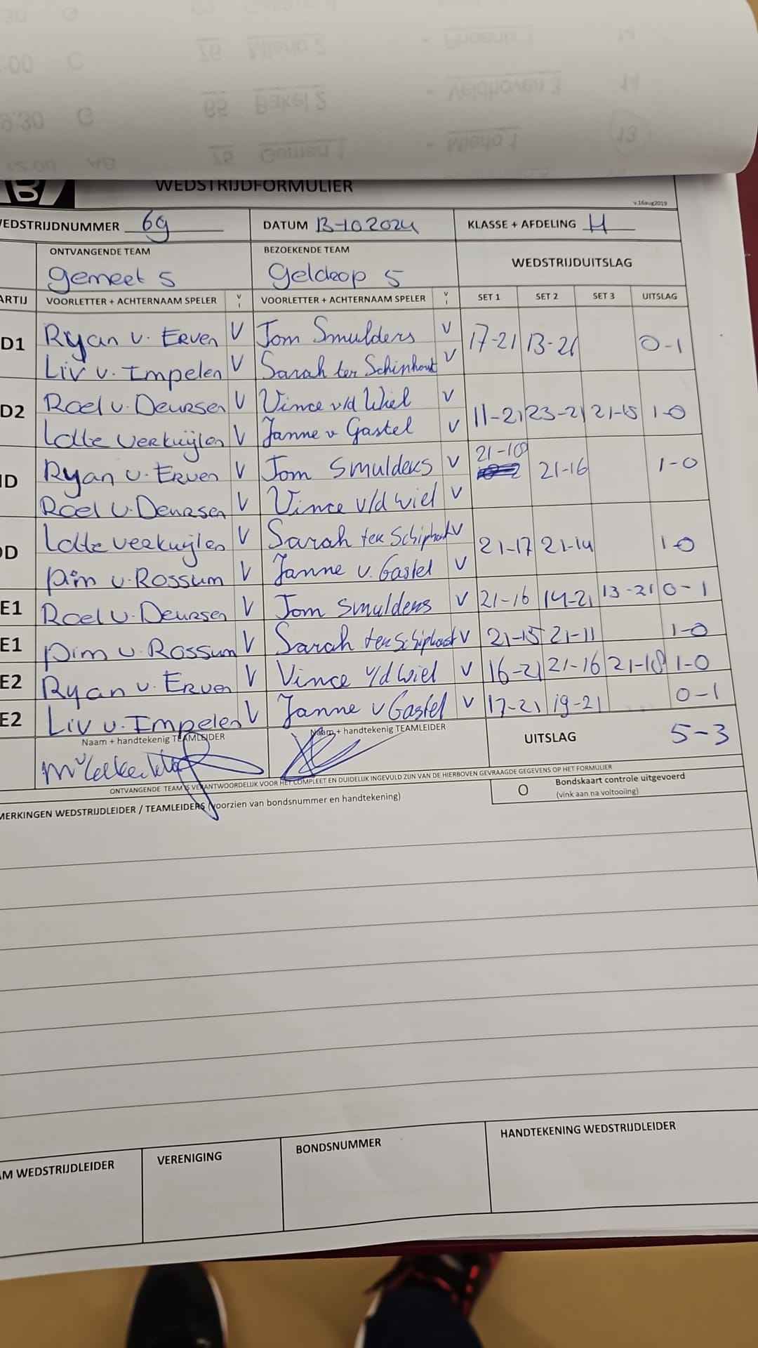 | 12:30 | zo. 13-10-2024 | Gemert 5 | - | Geldrop 5 | 3 | 5 - 3 | ||
