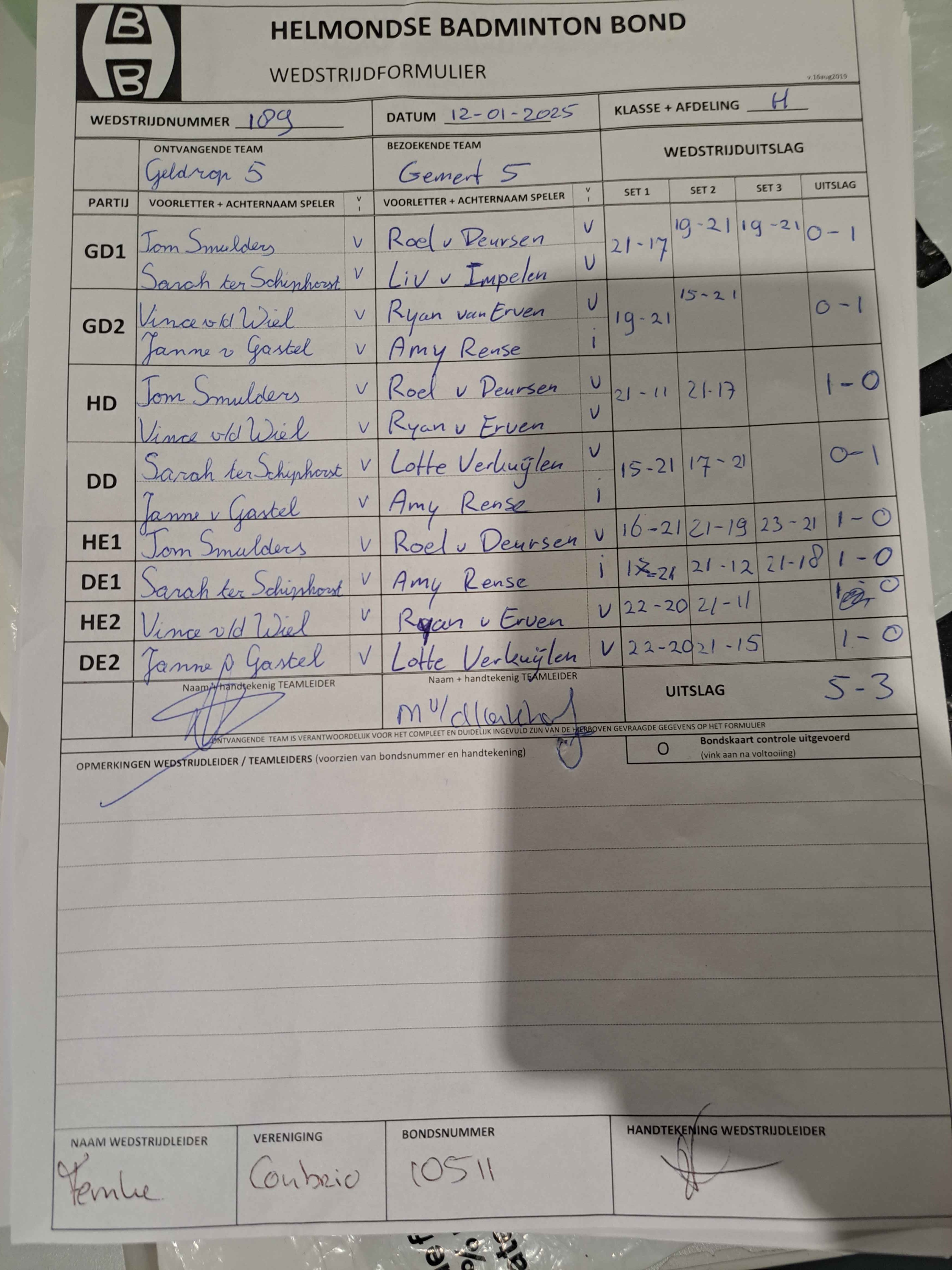| 09:30 | zo. 12-01-2025 | Geldrop 5 | - | Gemert 5 | 1 | 5 - 3 | ||