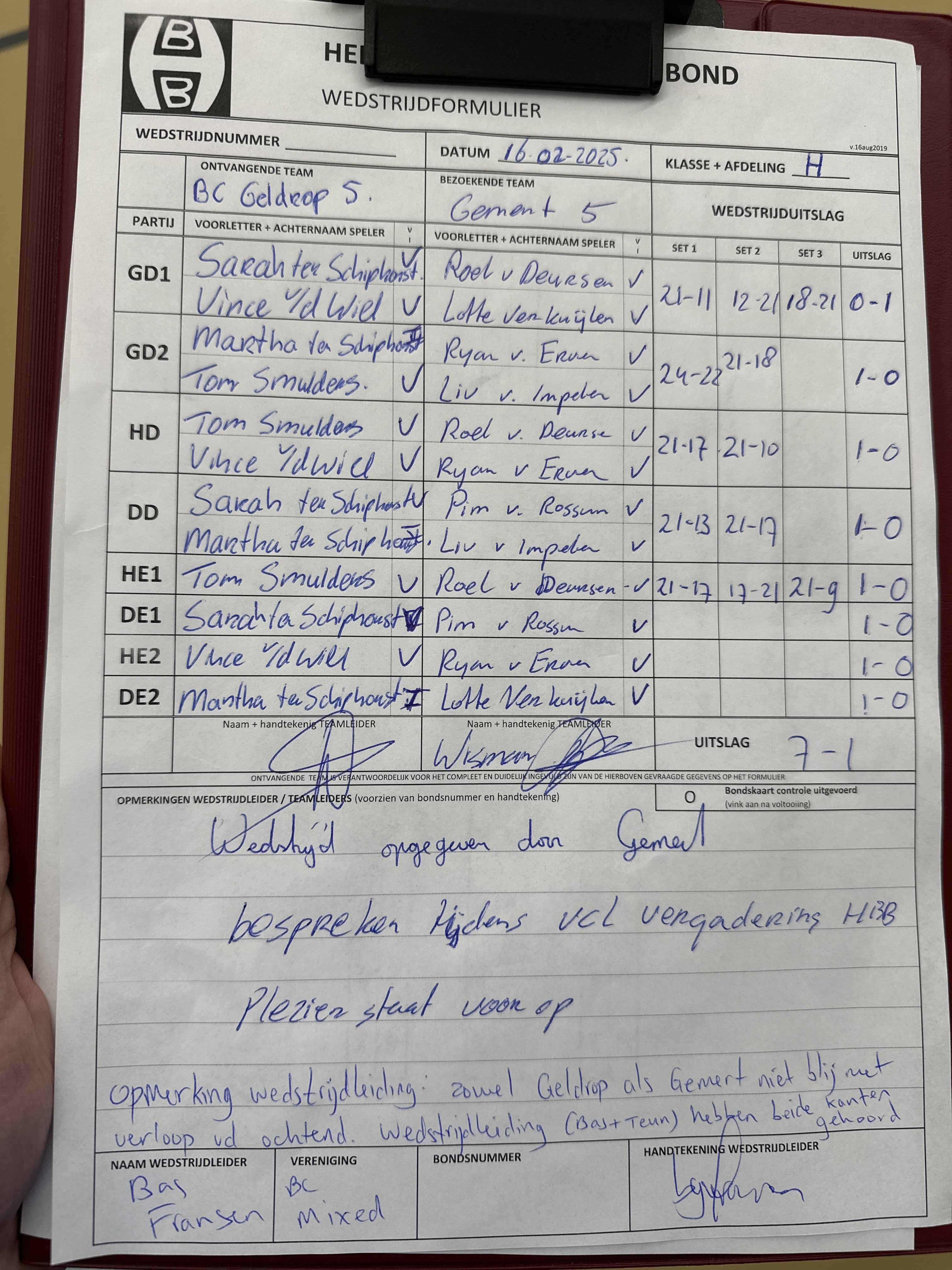 | 09:30 | zo. 09-02-2025 | Mixed 8 | - | Gemert 5 | 13 | 1 - 7 | ||