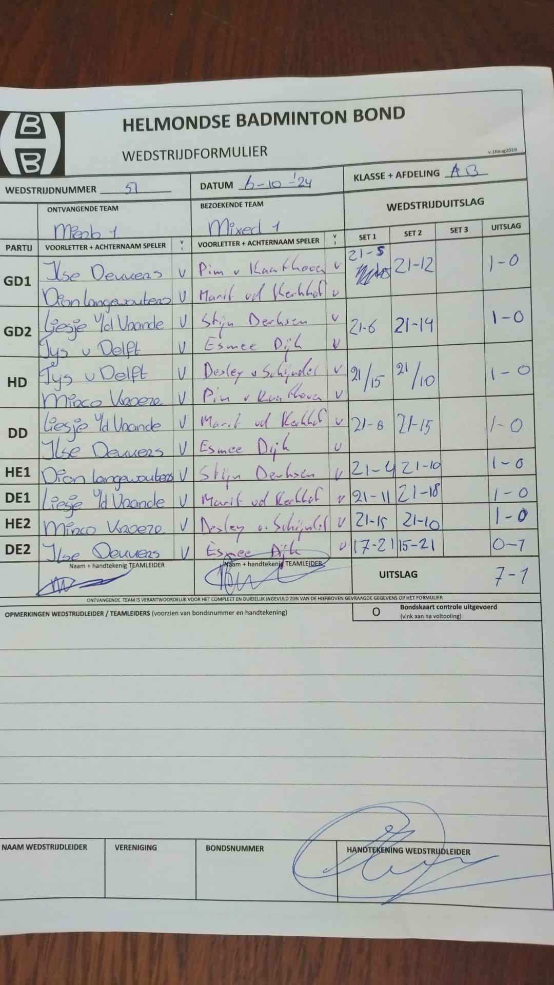 | 12:30 | zo. 06-10-2024 | Mierlo 1 | - | Mixed 1 | 11 | 7 - 1 | ||