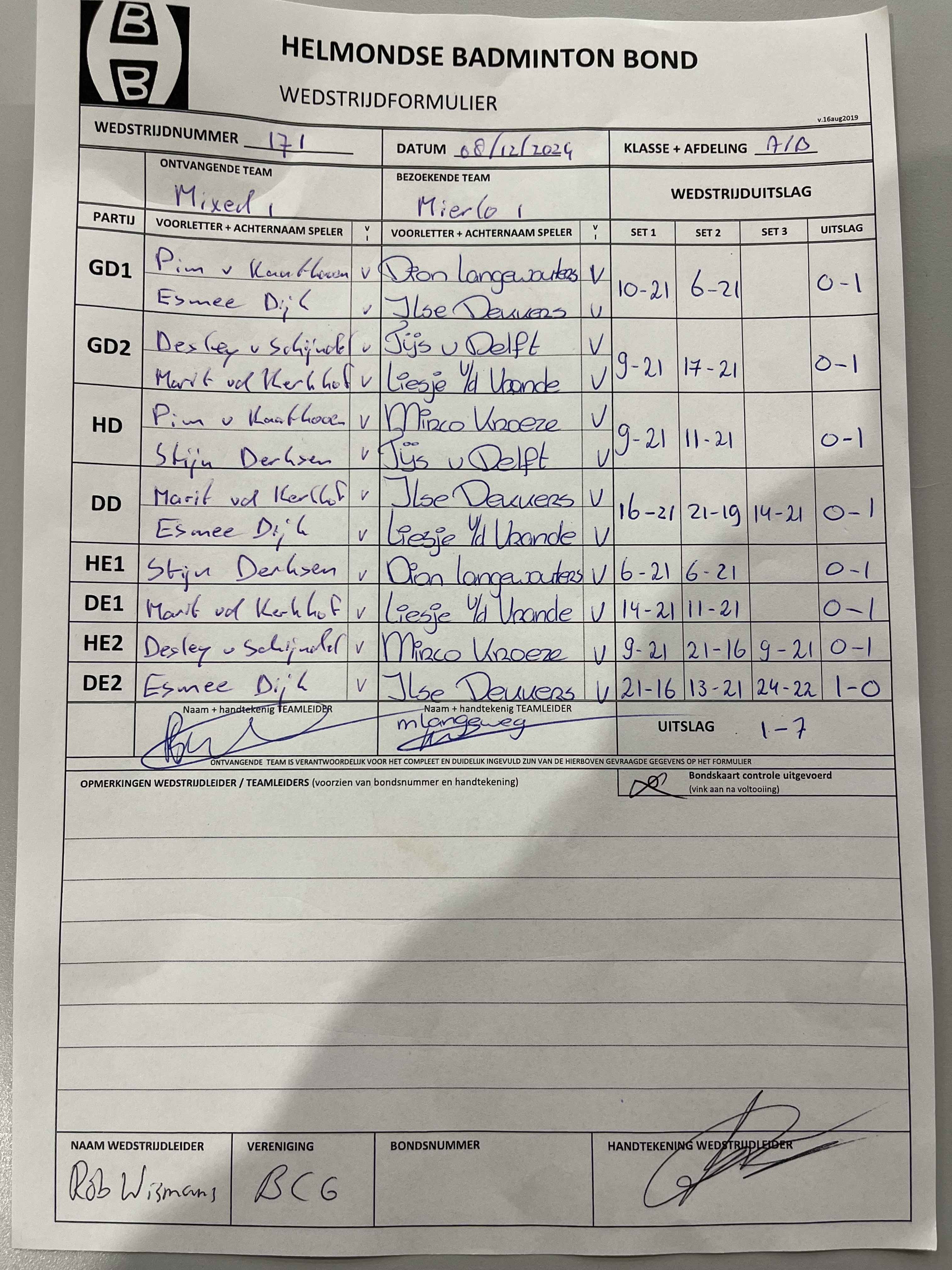 | 12:30 | zo. 08-12-2024 | Mixed 1 | - | Mierlo 1 | 3 | 1 - 7 | ||
