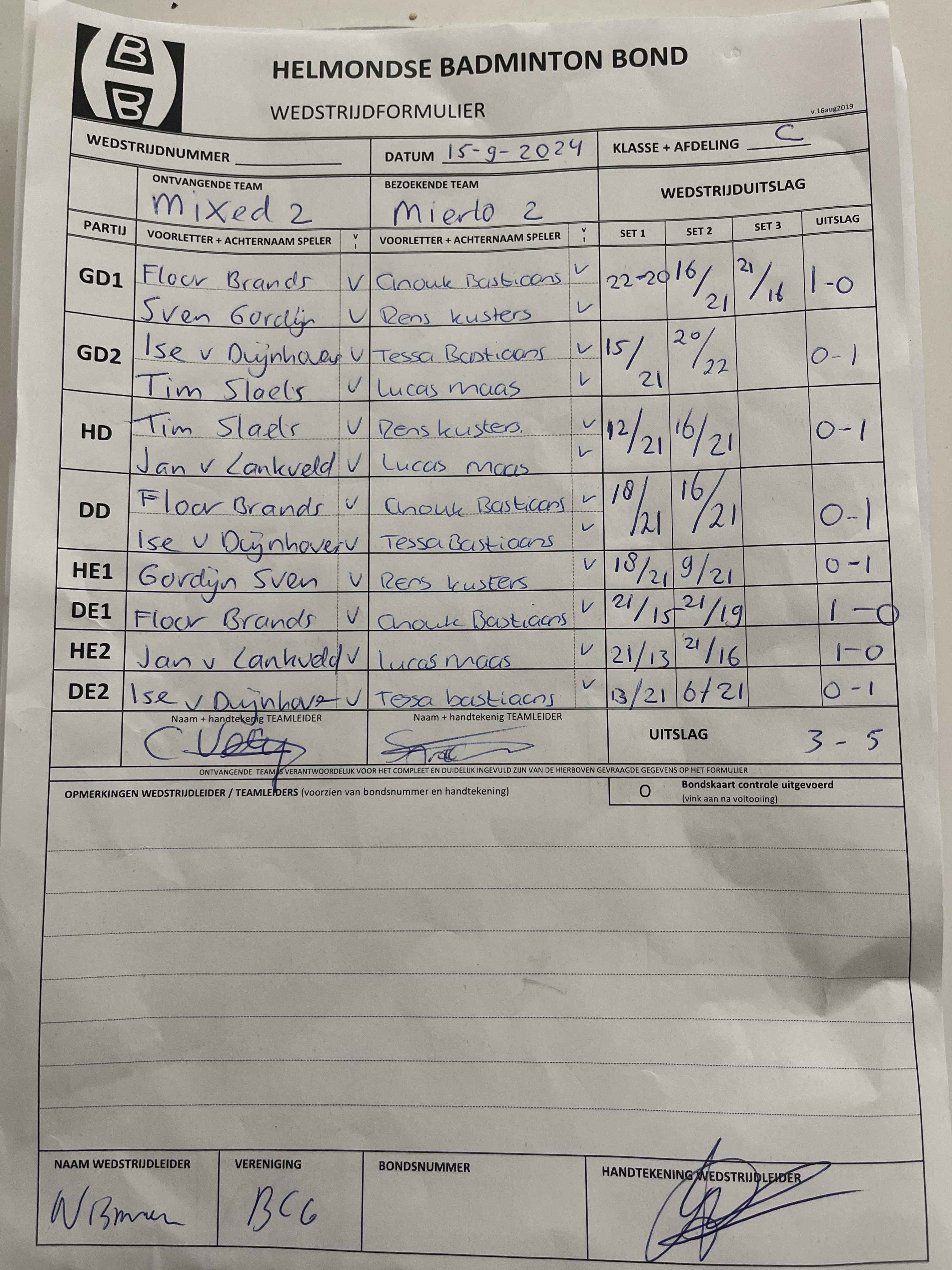 | 09:30 | zo. 15-09-2024 | Mixed 2 | - | Mierlo 2 | 10 | 3 - 5 | ||