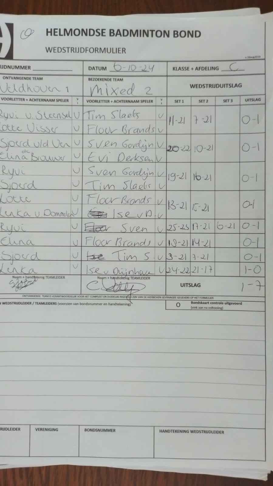 | 12:30 | zo. 06-10-2024 | Veldhoven 1 | - | Mixed 2 | 14 | 1 - 7 | ||