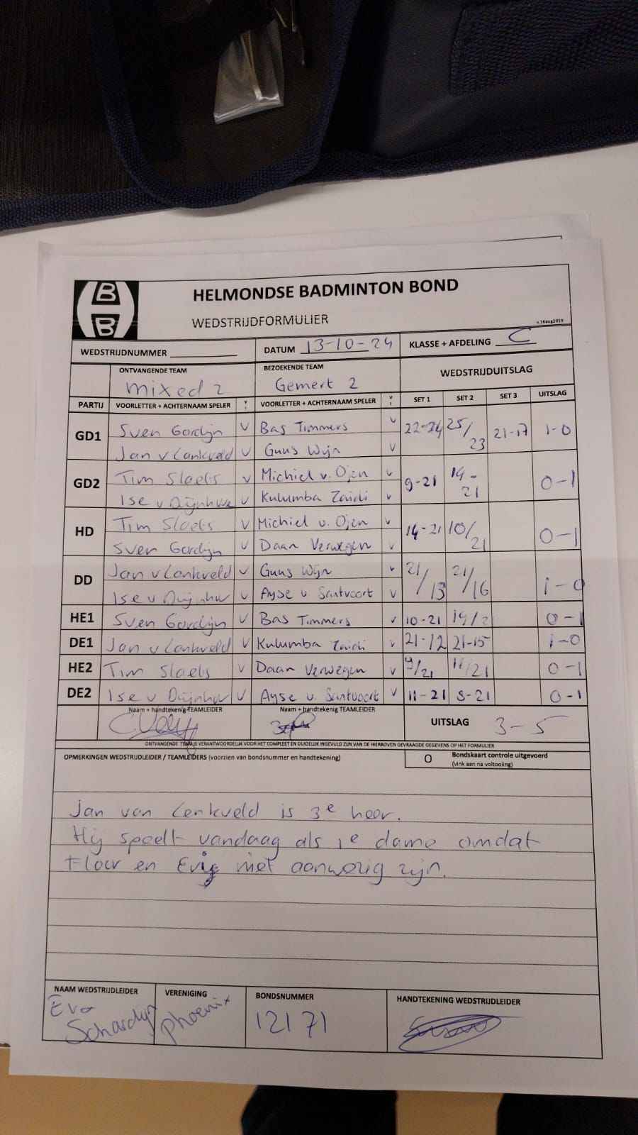 | 09:30 | zo. 13-10-2024 | Mixed 2 | - | Gemert 2 | 4 | 3 - 5 | ||