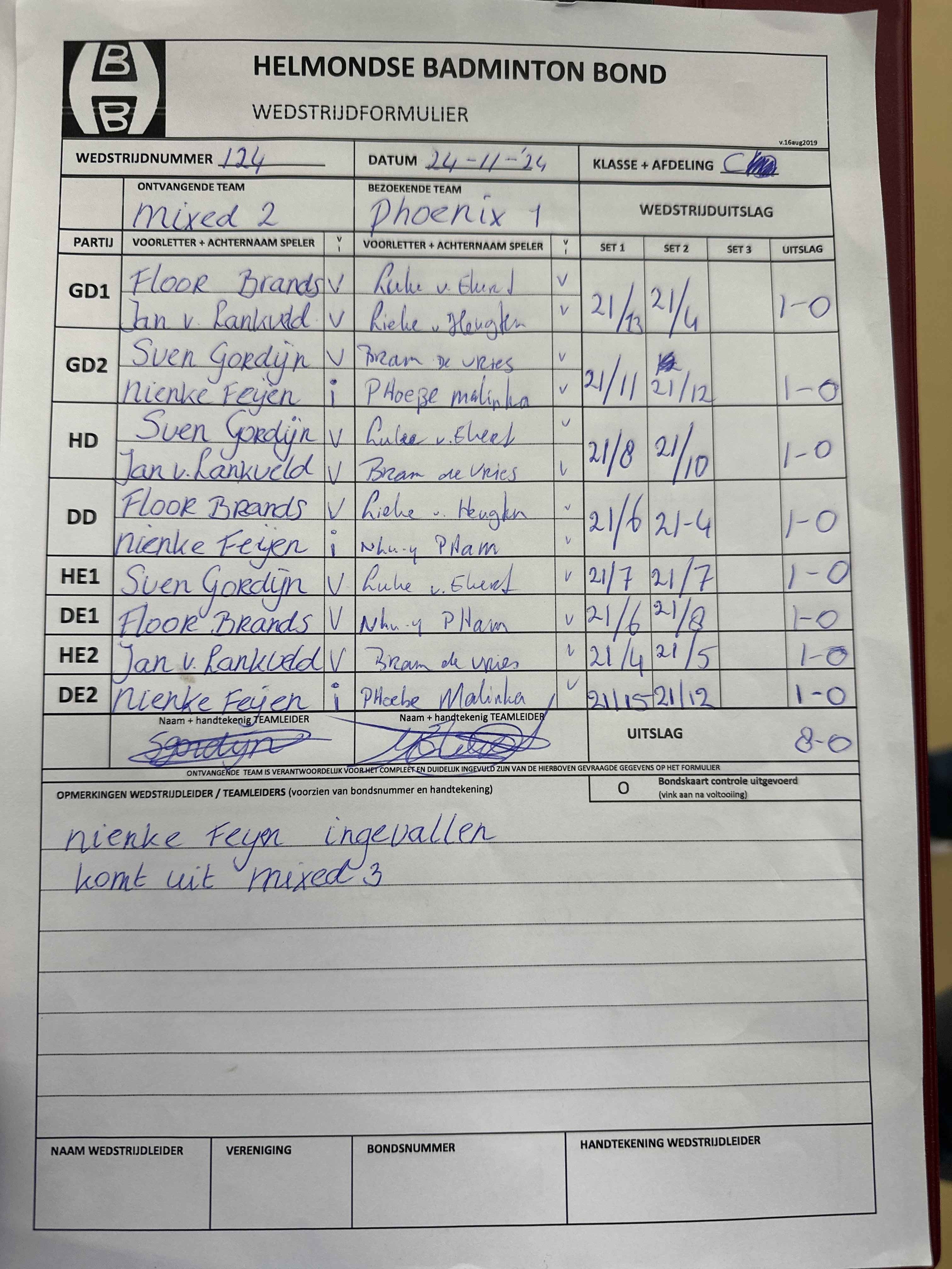 | 09:30 | zo. 24-11-2024 | Mixed 2 | - | Phoenix 1 | 11 | 8 - 0 | ||