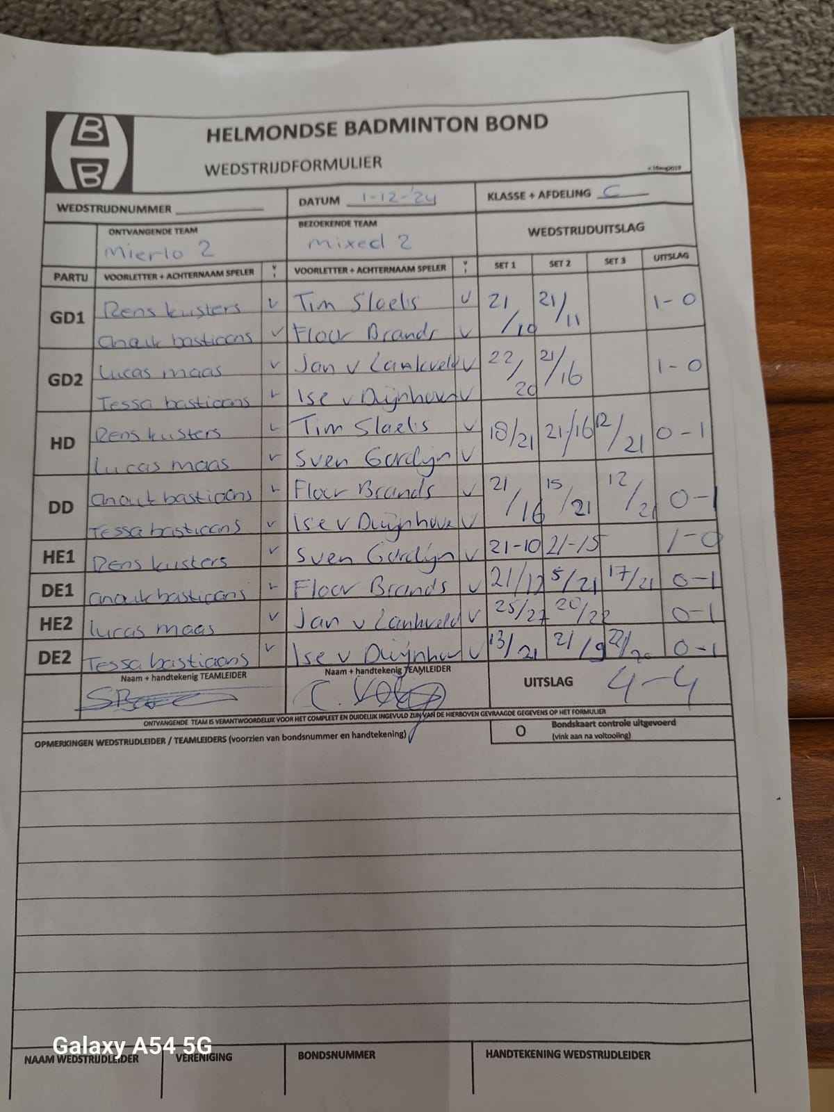 | 09:30 | zo. 01-12-2024 | Mierlo 2 | - | Mixed 2 | 15 | 4 - 4 | ||