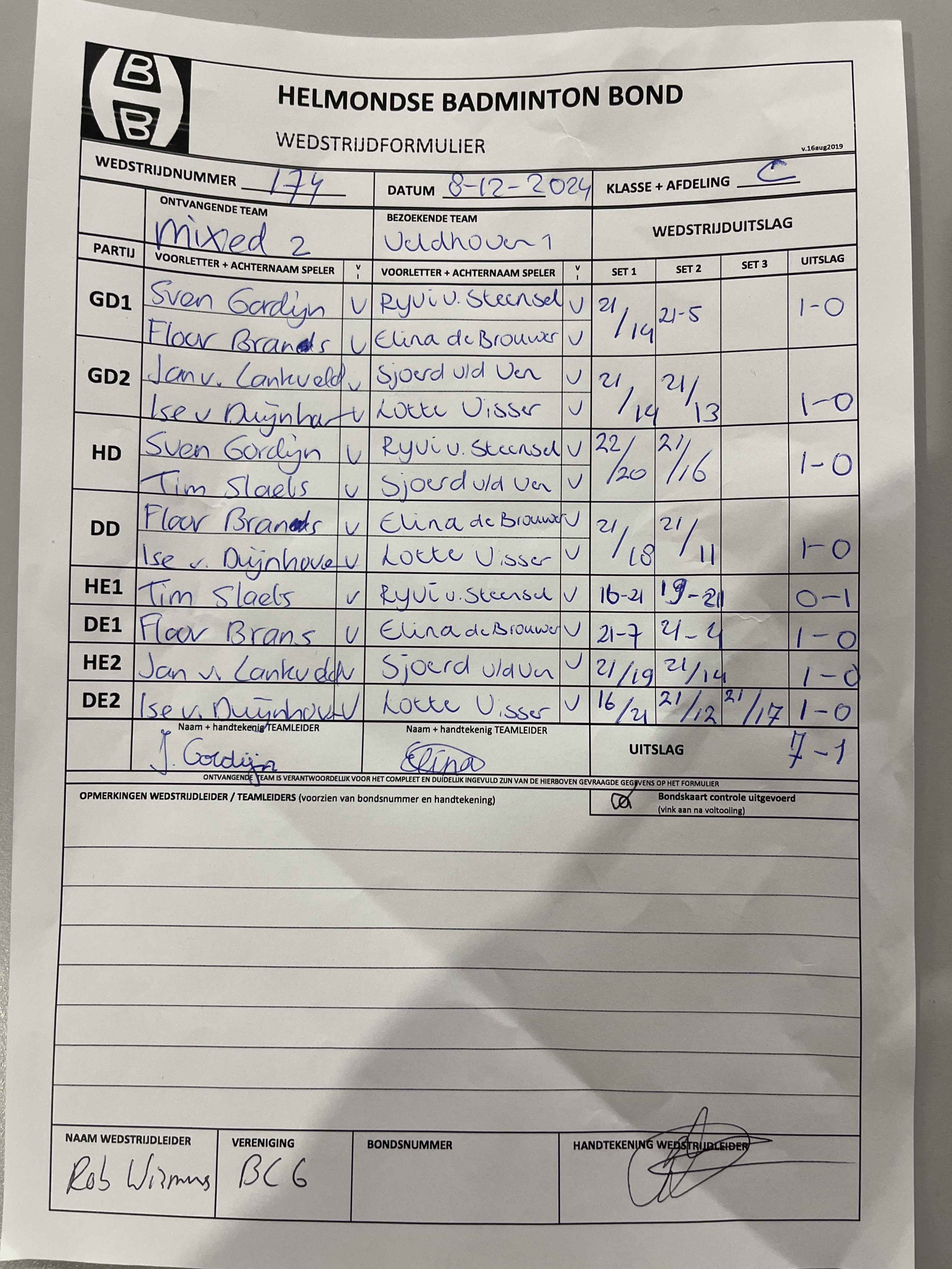 | 12:30 | zo. 08-12-2024 | Mixed 2 | - | Veldhoven 1 | 11 | 7 - 1 | ||
