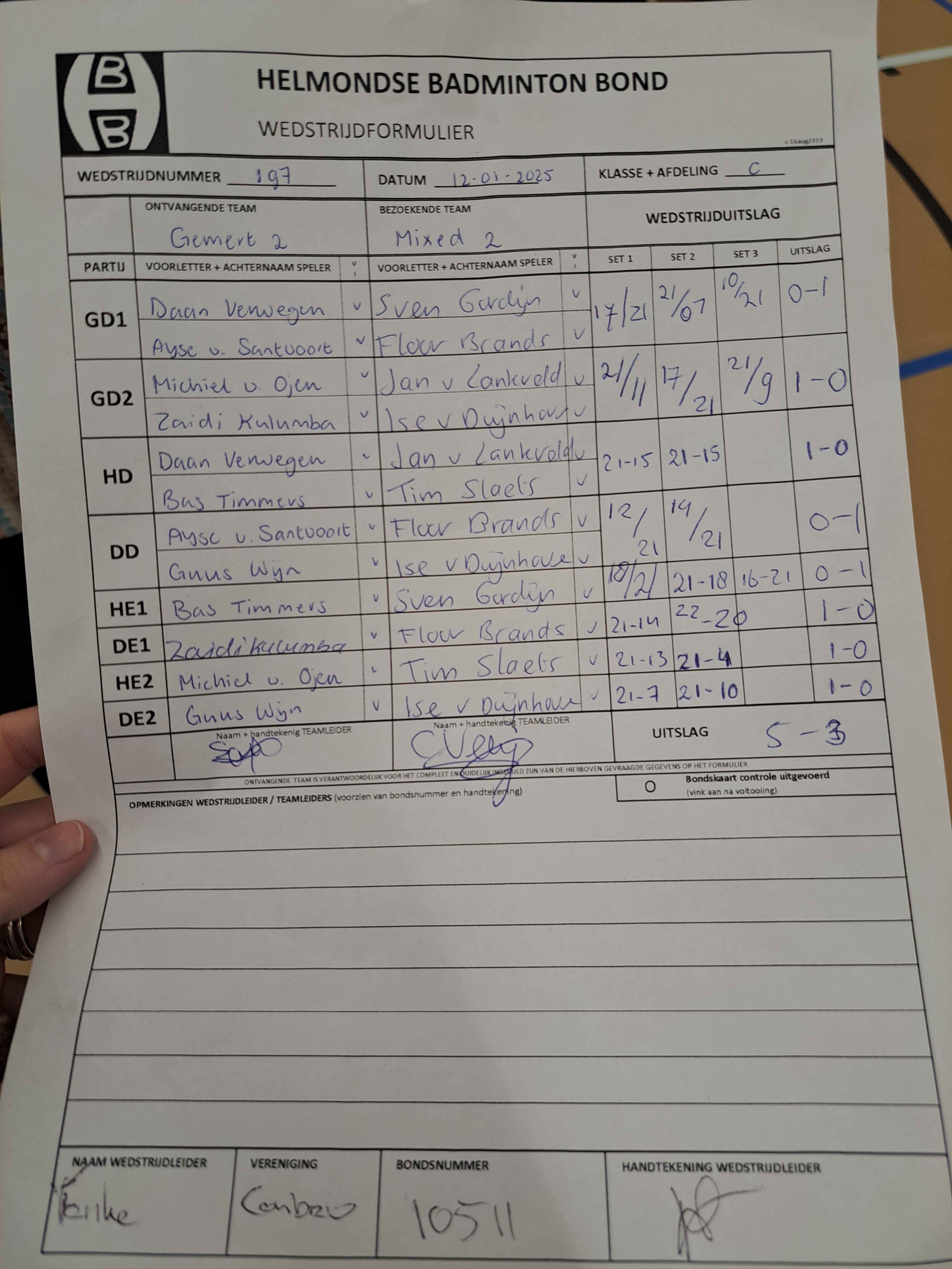 | 09:30 | zo. 12-01-2025 | Gemert 2 | - | Mixed 2 | 14 | 5 - 3 | ||
