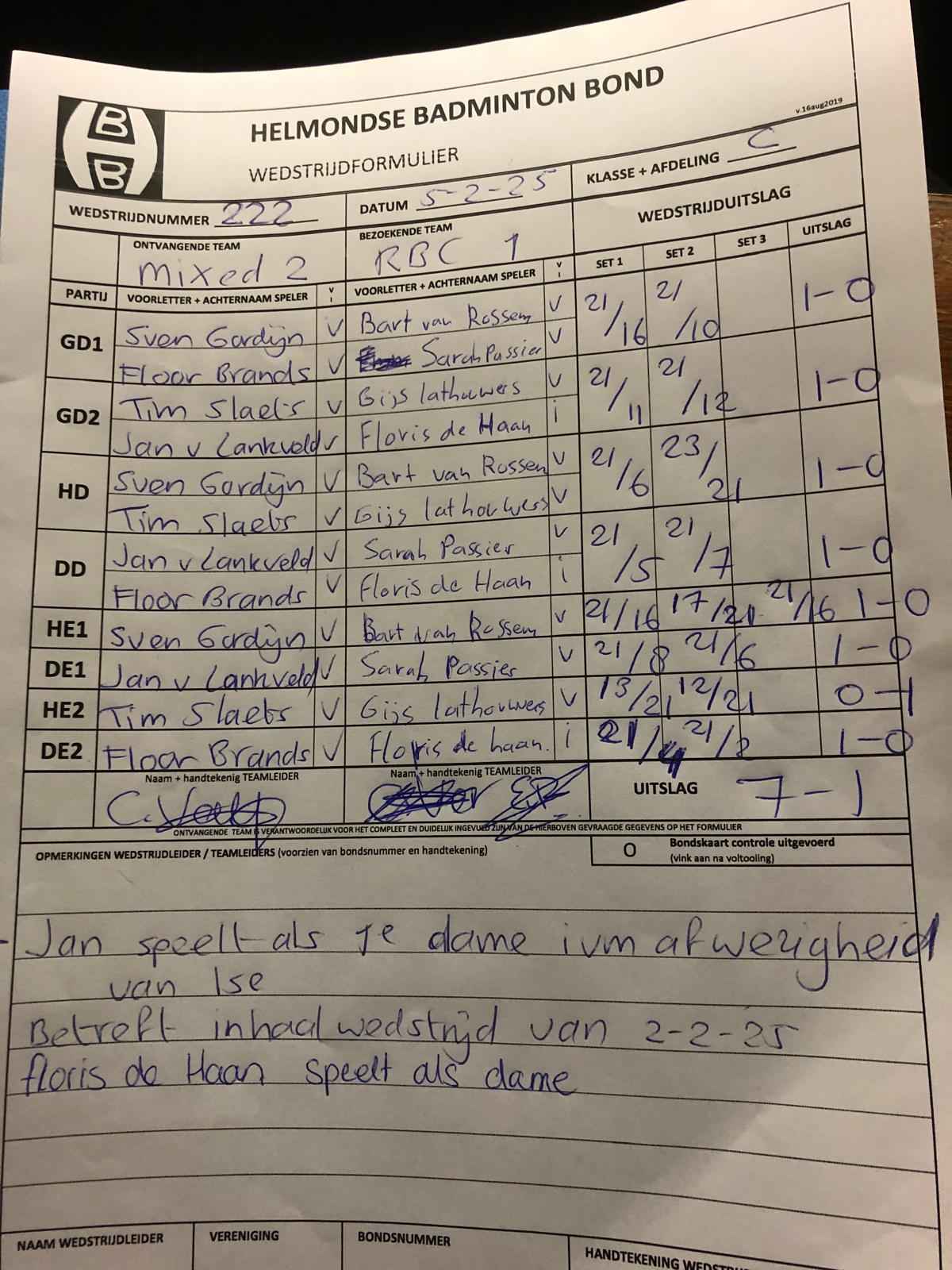 | 12:30 | zo. 02-02-2025 | Mixed 2 | - | RBC 1 | 4 | 7 - 1 | ||